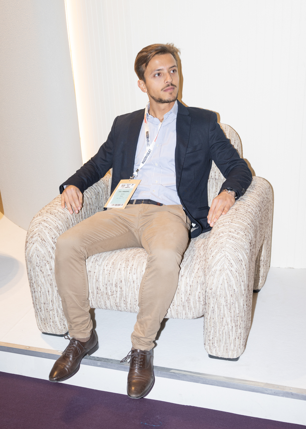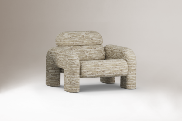- Designer Vitor Pinherio from Dooq sits on the Vertigo armchair inspired by the the sculptural qualities of the Brutalist movement.. Photo by Chris Force