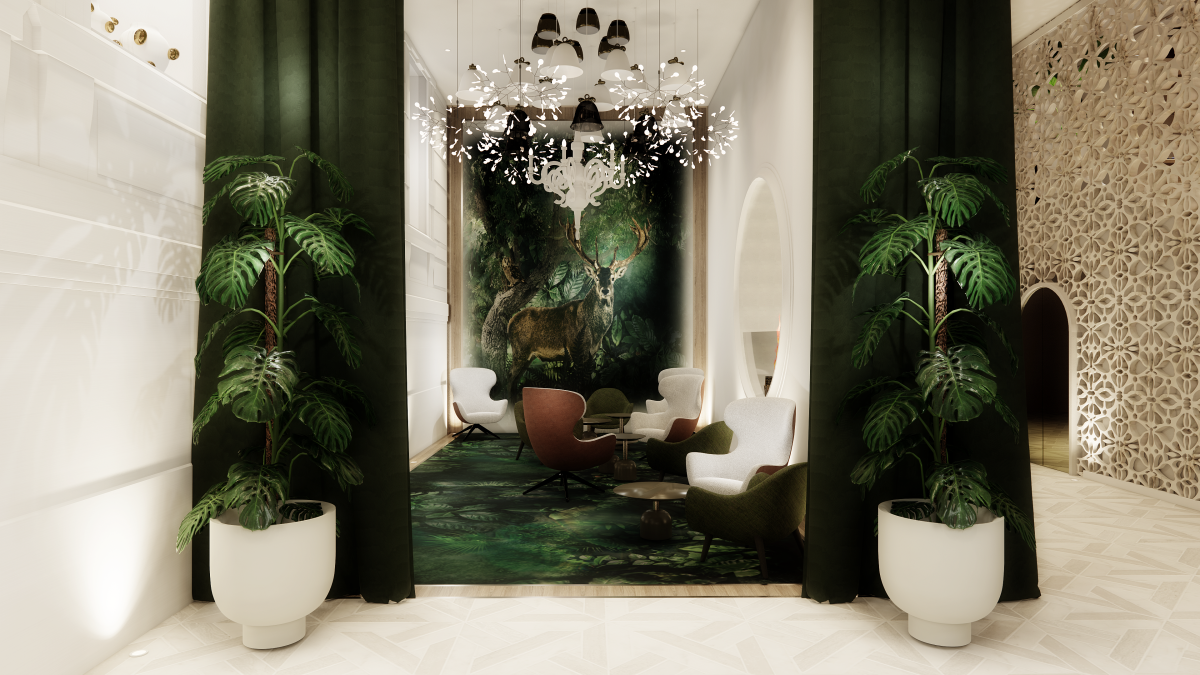 Throughout the space, intricate patterns and artistic details celebrate Hungary’s rich folklore, with motifs inspired by mythical creatures and native flora like poppies and tulips (above). The Golden Stag, another prominent folkloric character, is visible on the wall between shelves. A topiary sculpture designed by Marcel sits to the left of the desk. Photo courtesy Kimpton BEM Budapest