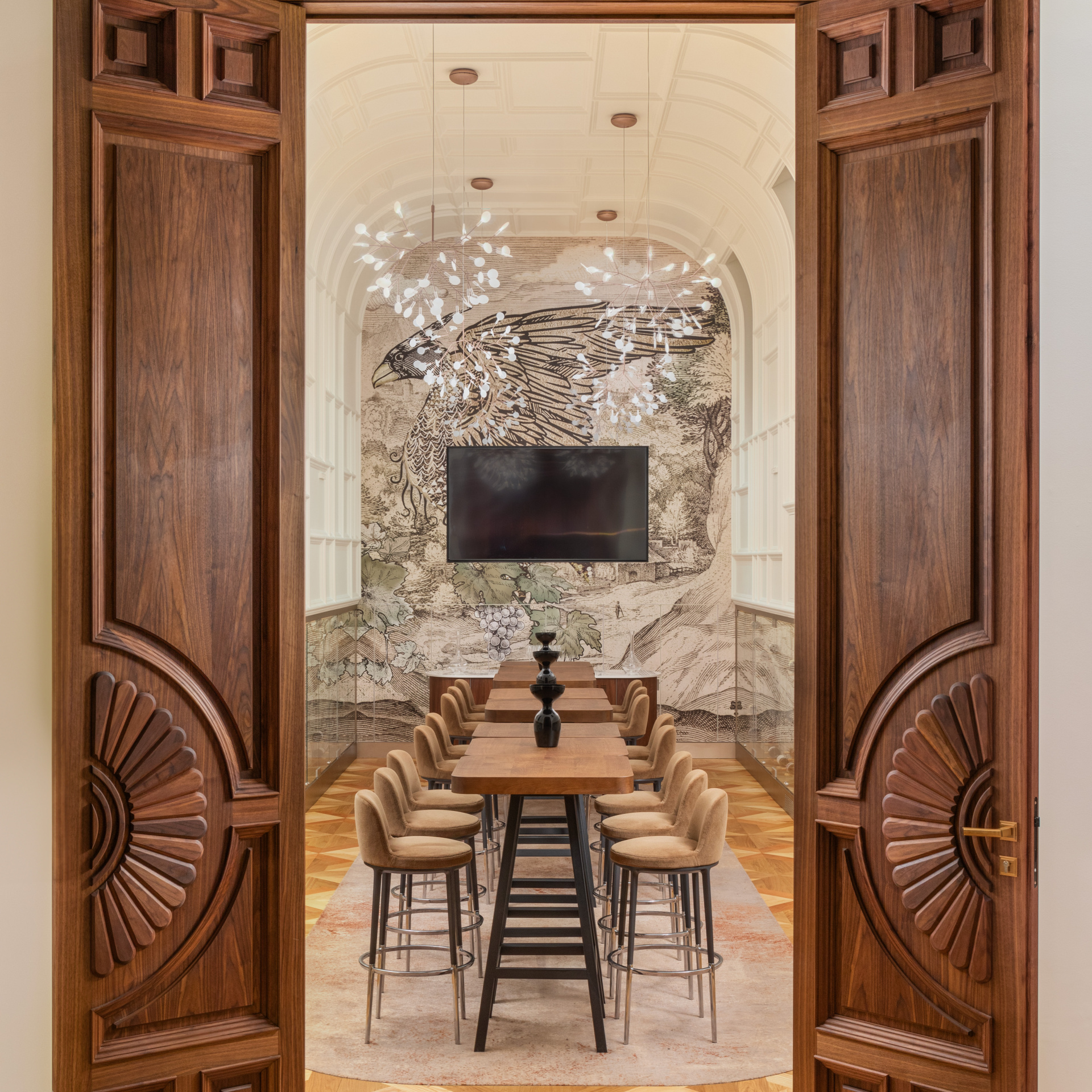 The Turul Room also provides a warm and inviting space for private dining and meetings. The Turul, a mythological bird of prey in Hungarian tradition, appears boldly on the room’s center wall designed by Marcel alongside the room’s other wallcoverings.