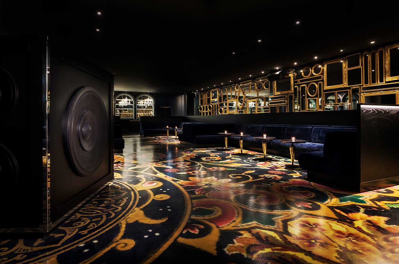 The Mondrian Doha in Qatar (2017) is a five-star destination designed by Marcel Wanders. From the atrium (top) to the pool (bottom), each space has its own identity while reflecting local patterns, Arabic writing, and historic souks. In the pool area, ornate stained glass adds to the luxurious experience.