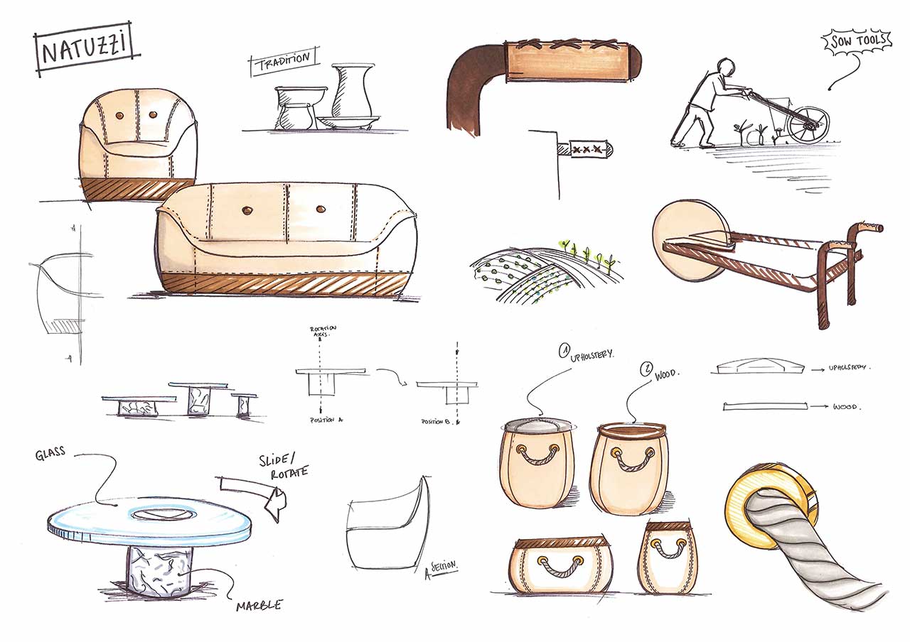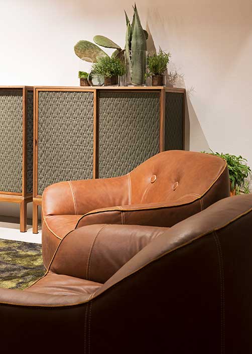 The collections for Natuzzi are inspired by the rich browns of the earth, the white houses of Ostuni in Italy, and the silvery tints of olive groves, to name a few.