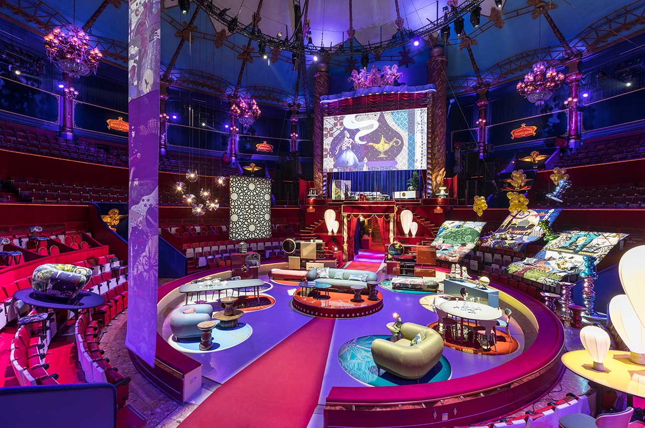 The Globe Trotter collection, a collaboration between Marcel and Roche Bobois, on display at the famed Cirque d’Hiver event space in Paris. Photo by Stevens Fremont.