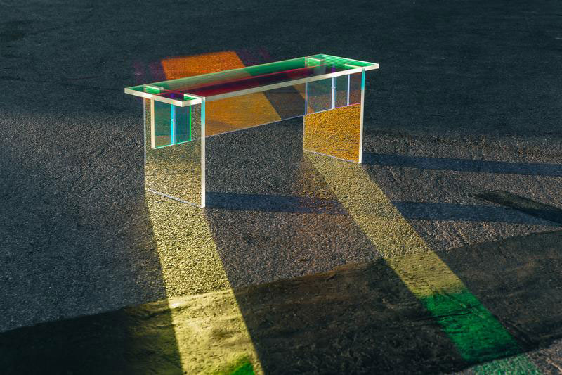 In an NFT world, Simon Barazin’s F04 rainbow-lit table-bench dances between physical furniture and computer simulation.
