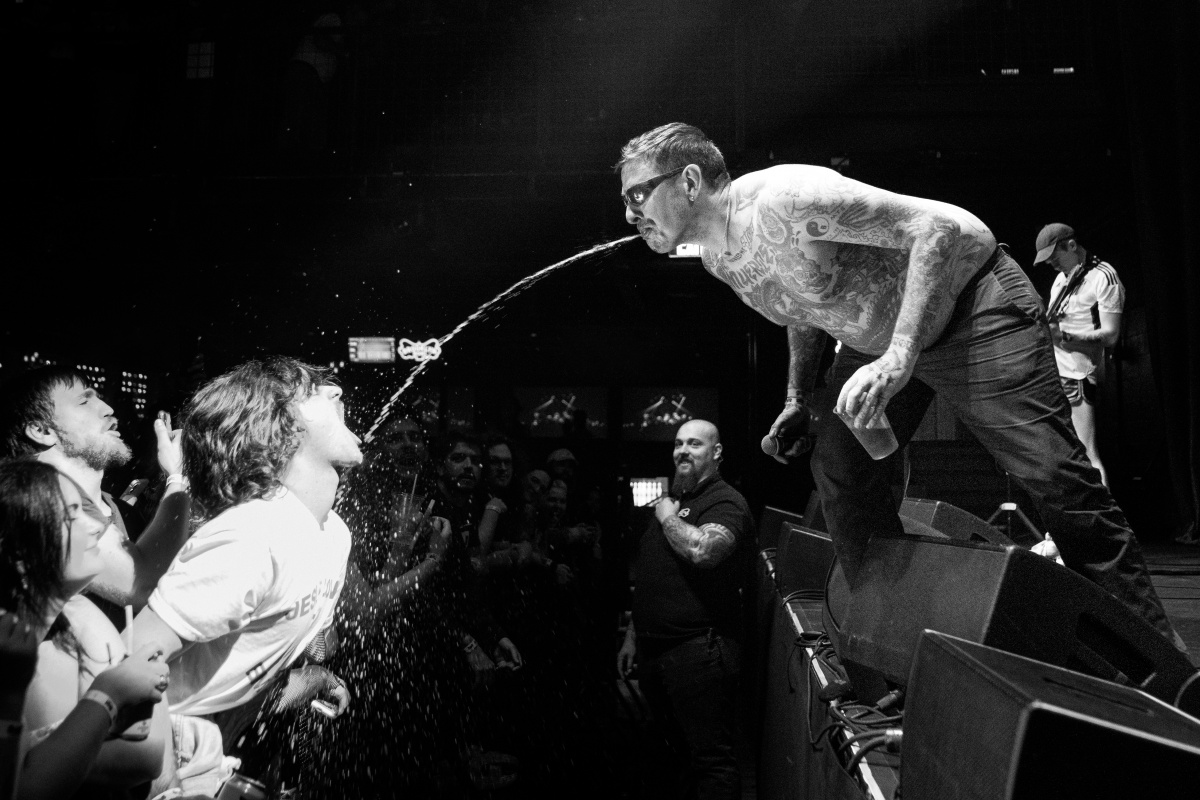 Sebastian Murphy of Swedish punk band Viagra Boys pulls an impromptu stage antic. Photo by Pooneh Ghana