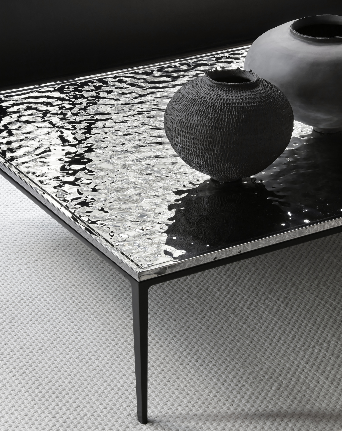 - The Soleide series of coffee tables and consoles features a die-cast aluminum base and a top in hammered mirror steel that gives them a particularly original effect.