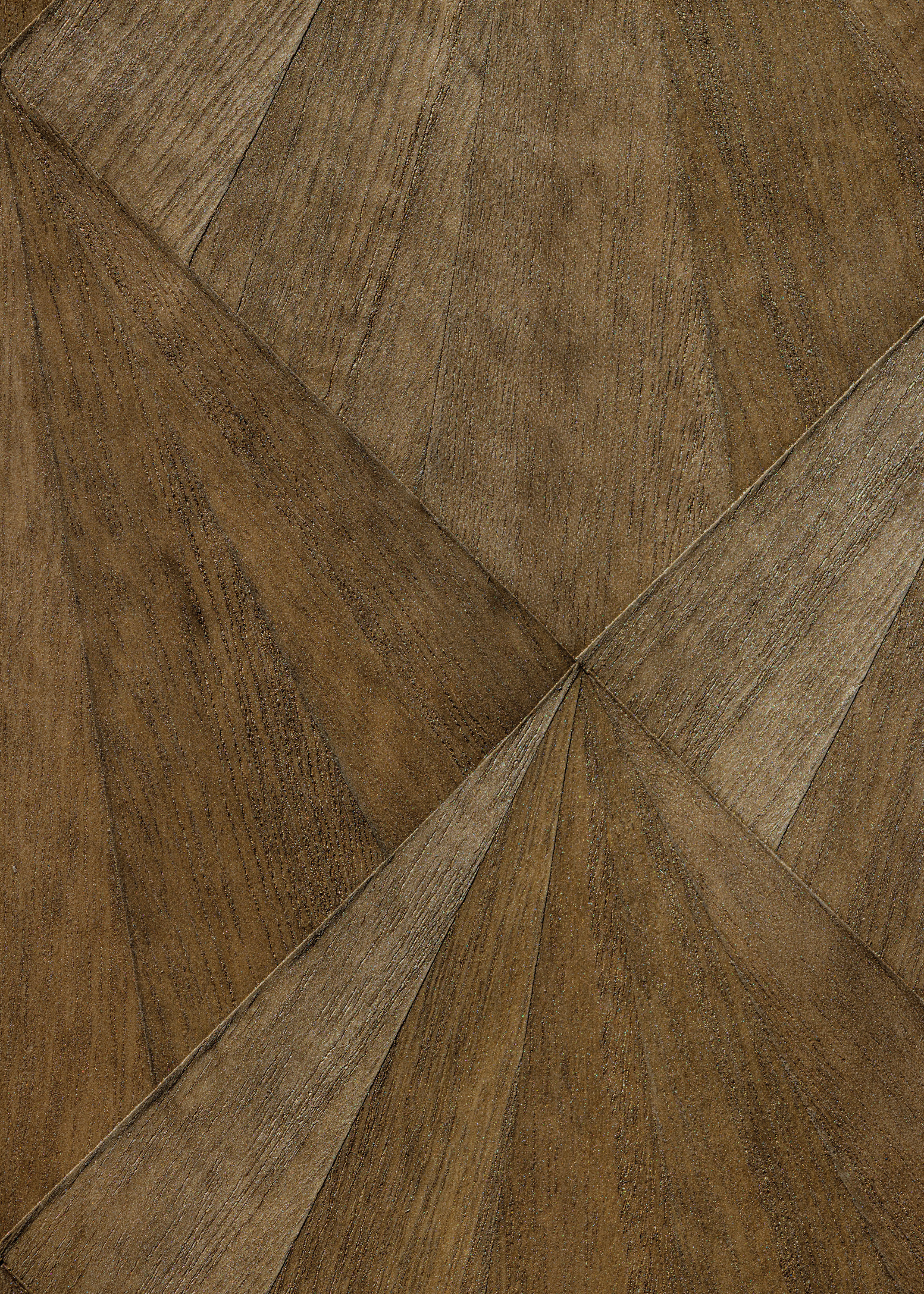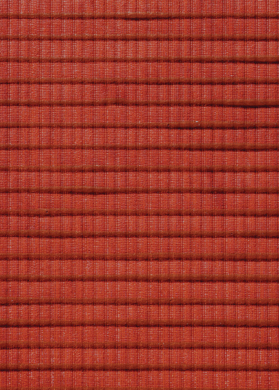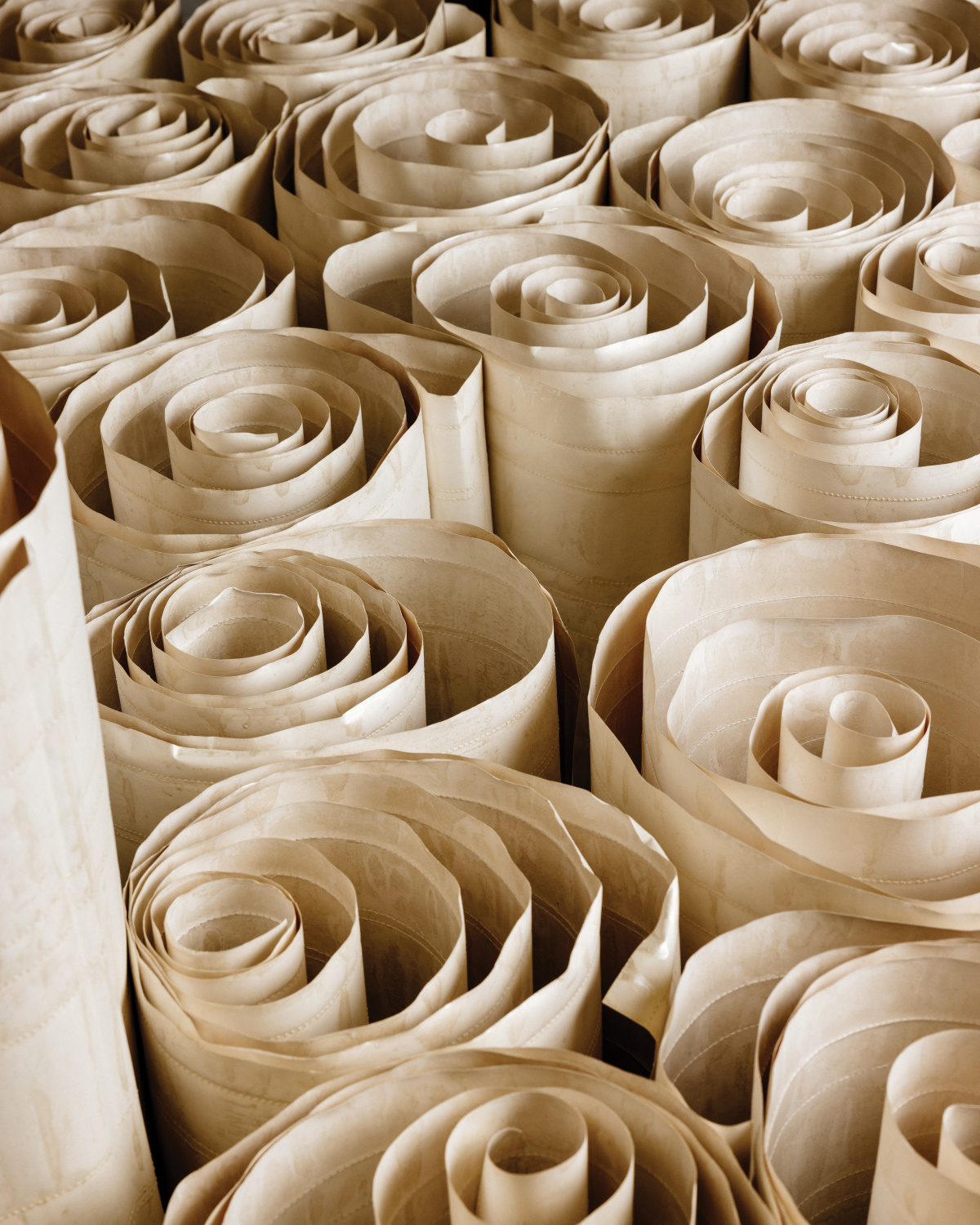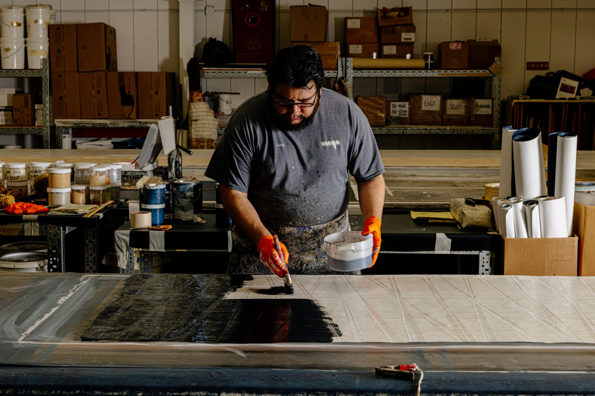 The Conduit Collection is made entirely by hand, beginning with a Forest Stewardship Council–certified, non-woven paper. A team of two artists applies a proprietary compound, which they rake vertically down the paper with a 36-inch comb specially made to the width of the paper. The production duo then brings out the conduit pipe for a series of press-and-wiggle stamps across the compound, creating a light crisscross pattern. After the compound is dry the paper gets a base coat of water-based color, followed by hand-applied (or more accurately sponge-applied) metallic tipping.