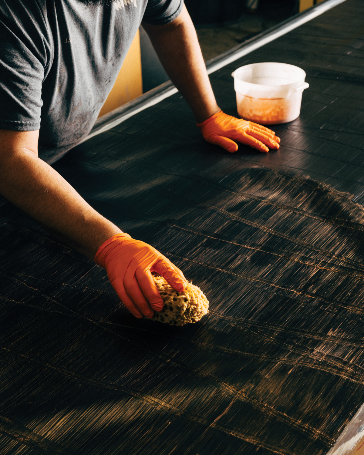 “At first I mixed the metallic into the color itself. Now we have changed to the faster way: we spray the color, and then we do a little metallic accent on top,” Bo says. Pictured, the base color being applied.