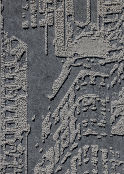 A recent addition to the line in 2023, Conduit, stems from Maya’s spirit of experimentation and play. When a client specified a custom wallcovering, Studio Creative Director Nabopha LY Om, known as Bo, began to play with raked compound and linear impressions. She was aiming for a vertical variation on Weathered Walls, one of Maya’s core designs with a horizontal watermark effect similar to clouds, but she just wasn’t finding the right way to create the textural depth.
