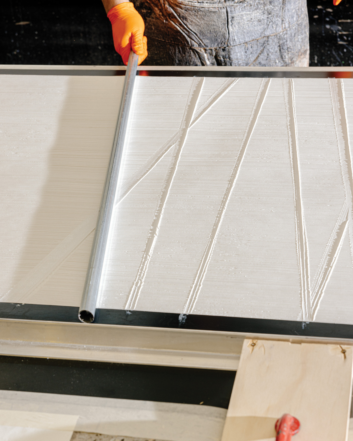 - “I am open to everything, because anything that I see or I feel like, I can try and see how it looks,” Bo says. Top right, a specially made comb rakes the vertical striations into Conduit.