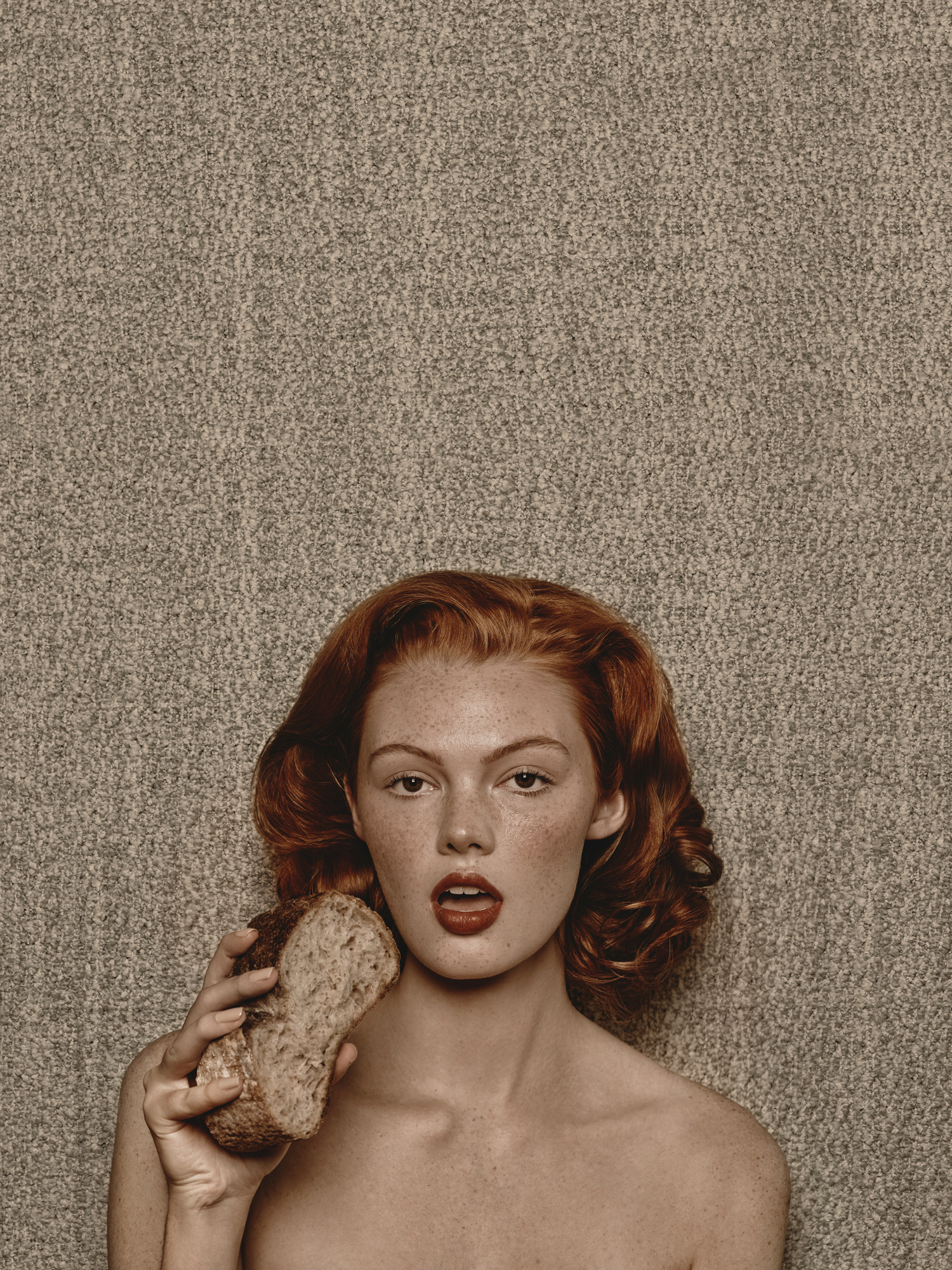 → TASTE. Artisan bread lifts to parted lips against Whispered Layers in Smoked Linen from MOHAWK GROUP, anticipating the first bite where texture promises crunch and speckled sandy tones mirror the bread’s warm, wheaten flavor.