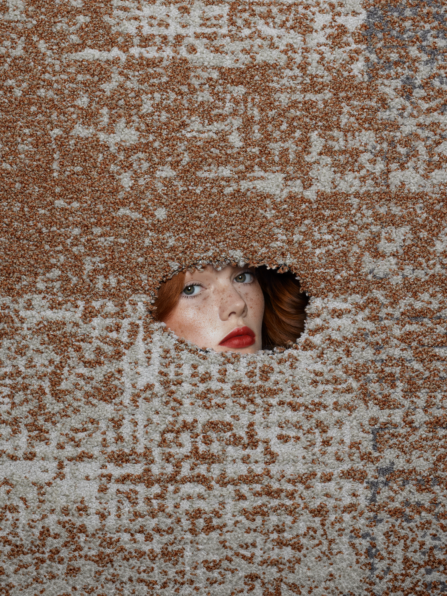 ← SIGHT. Eyes meet through Spectral View’s Flecked Ember palette from MOHAWK GROUP, where rust and cream patterns frame a face emerging from texture. Freckled skin and red lips draw focus against the carpet’s warm, weathered tones.