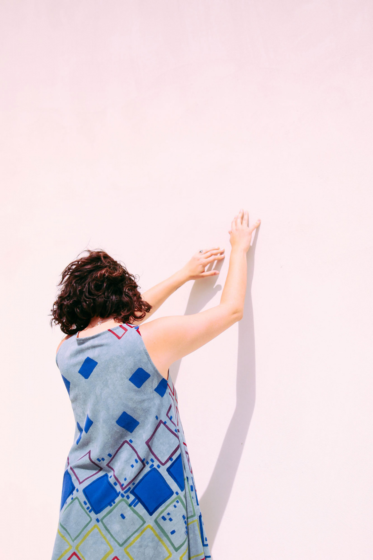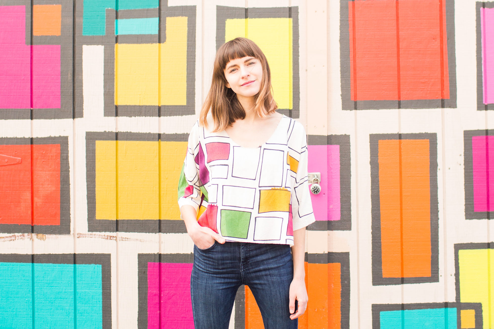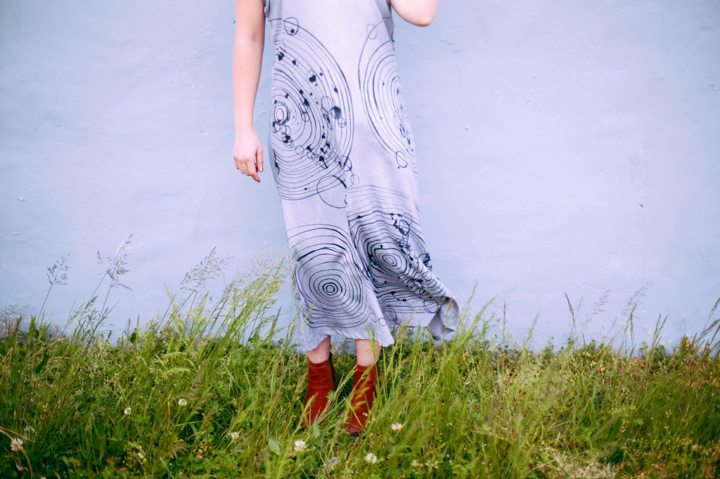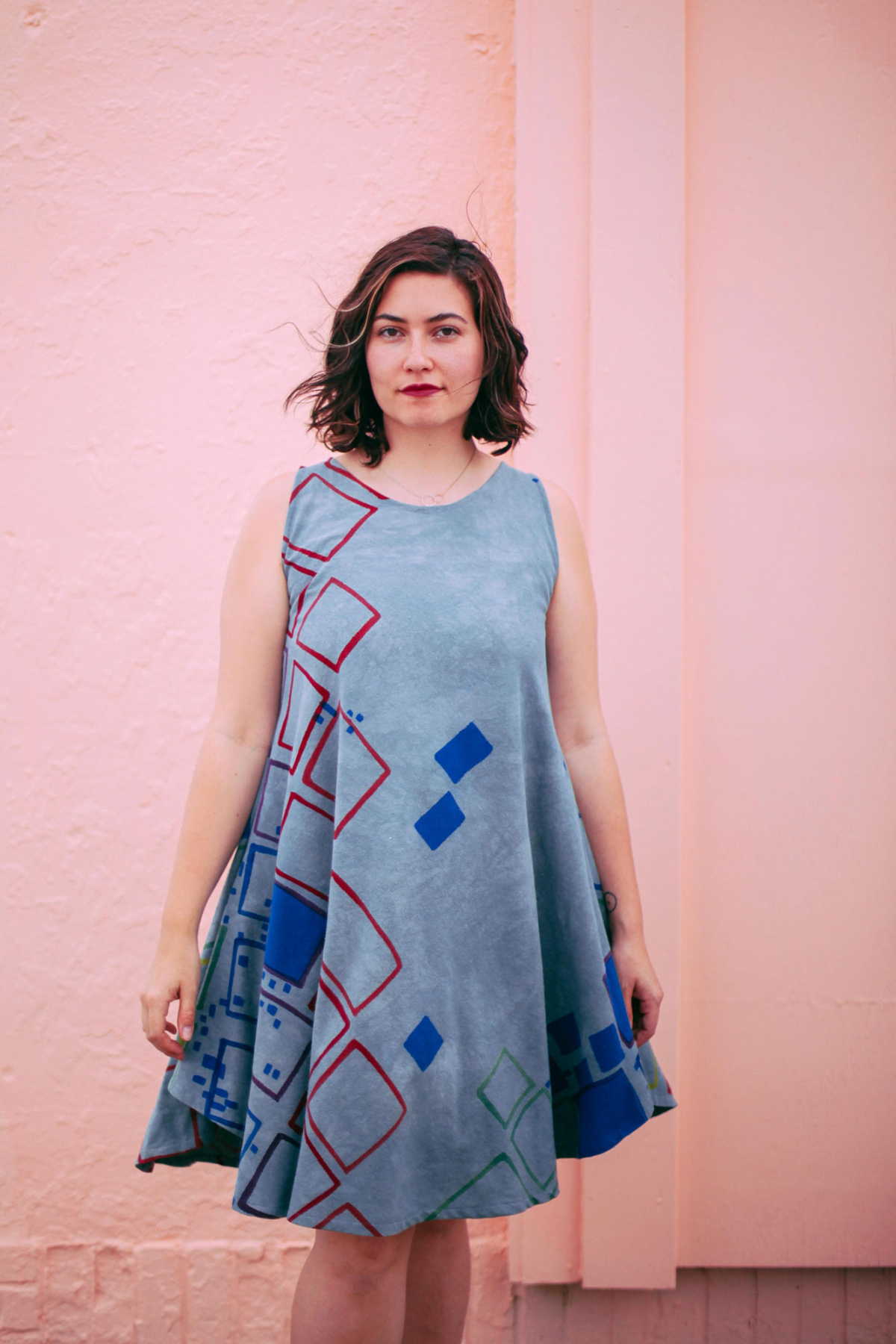 Colorful squares, cheerfully blue asteroids, a splash of confetti and limes; artist Nellie Rose Davis spends much of her time hand-painting whimsical apparel. Each garment from Nellie Rose Textiles is one of a kind and takes up to two weeks to make.