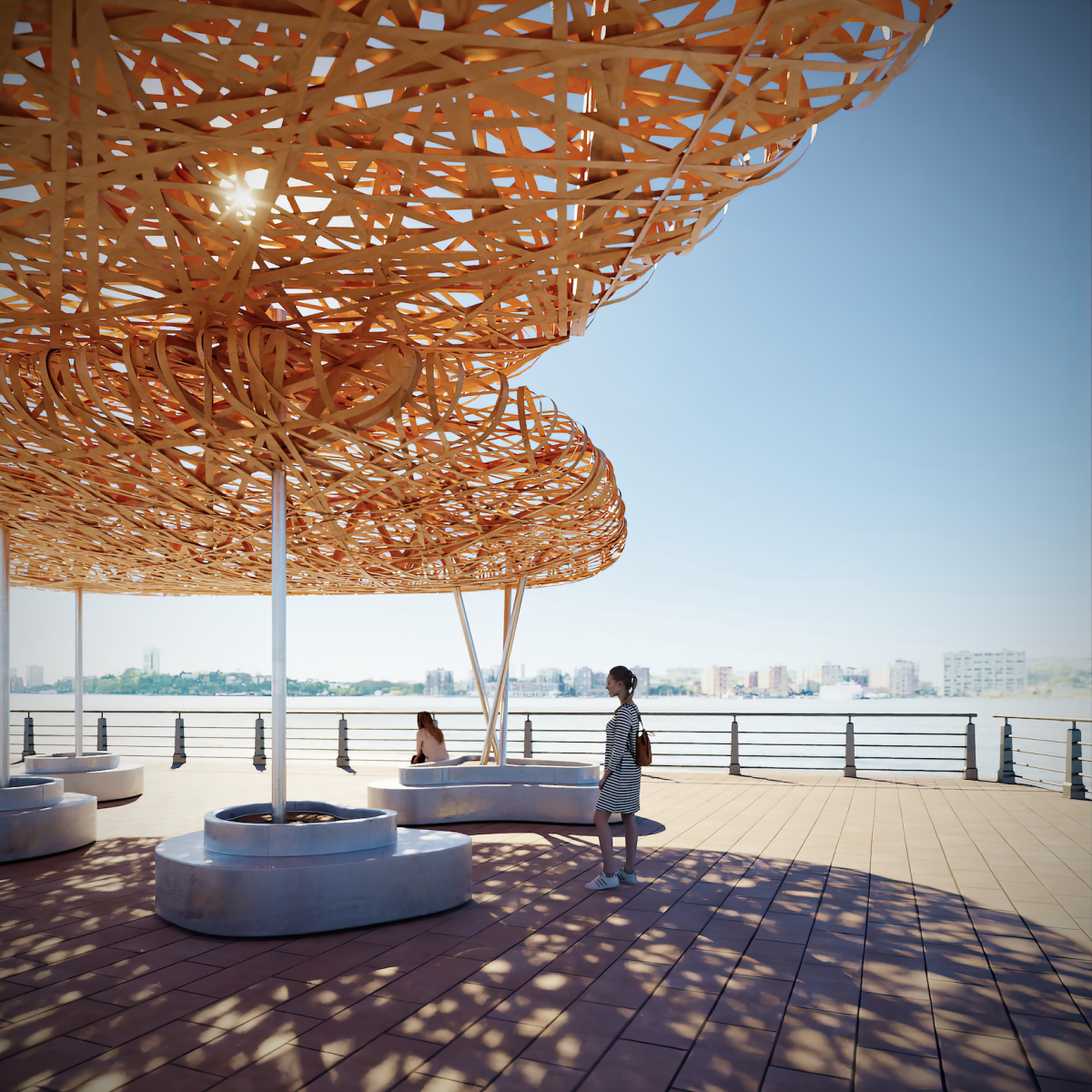 Also at Gansevoort Plaza, Public Display by Studio-Kër explores the innate qualities of cross-laminated timber, using its mass to express tension, connection, and balance. The installation is “a tribute to our environment, with a commitment to sustainability and an artistic presentation. Plus, the space offers a series of community conversations. To listen is to love, so we create sacred space to listen,” said Michael Bennett, founding principal and creative director of the studio (and former Super Bowl Champion and NFL defensive end).