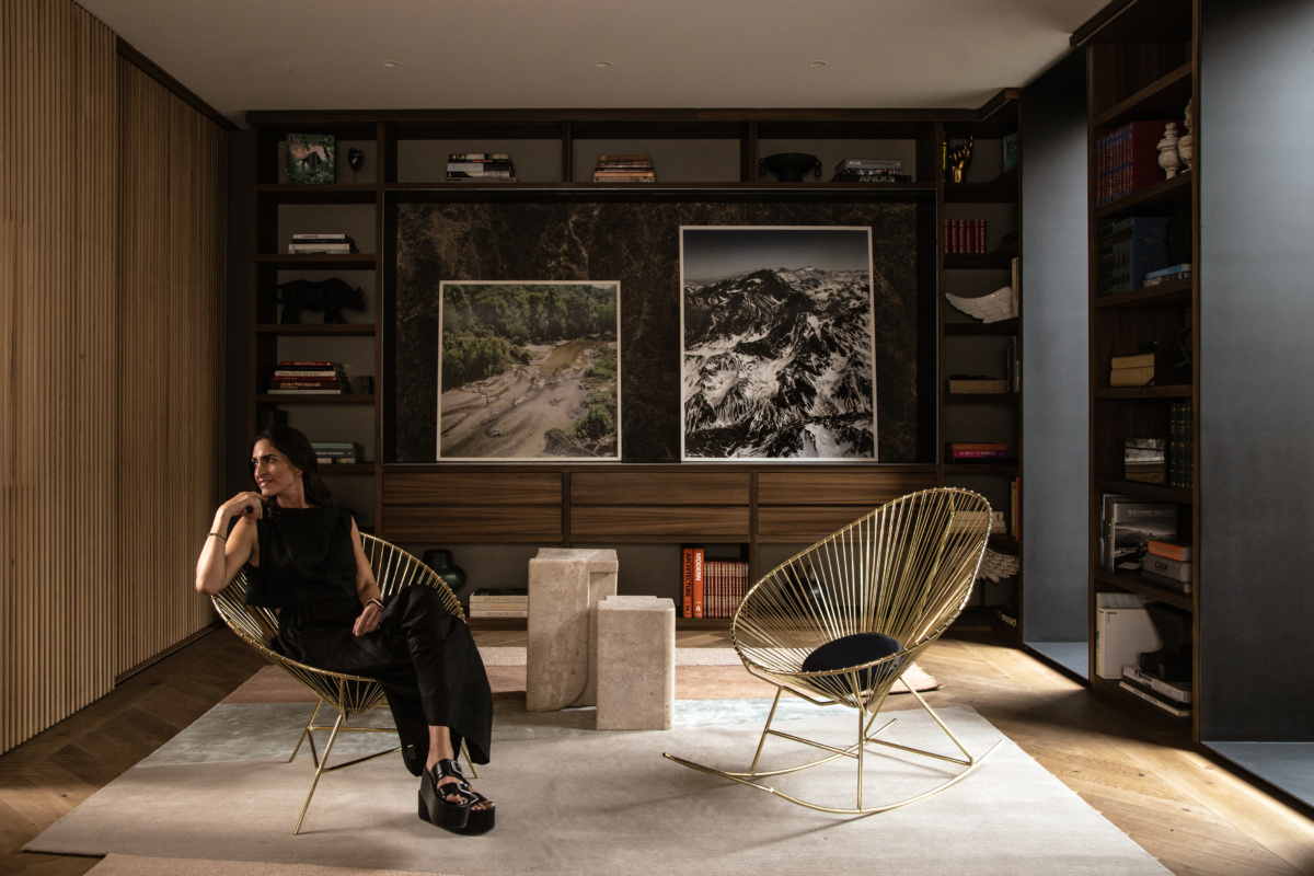 Lorena Vieyra sits with a chair and rocking chair by Veronica González. Modular side table by Raúl de la Cerda. Photo by Andayvé