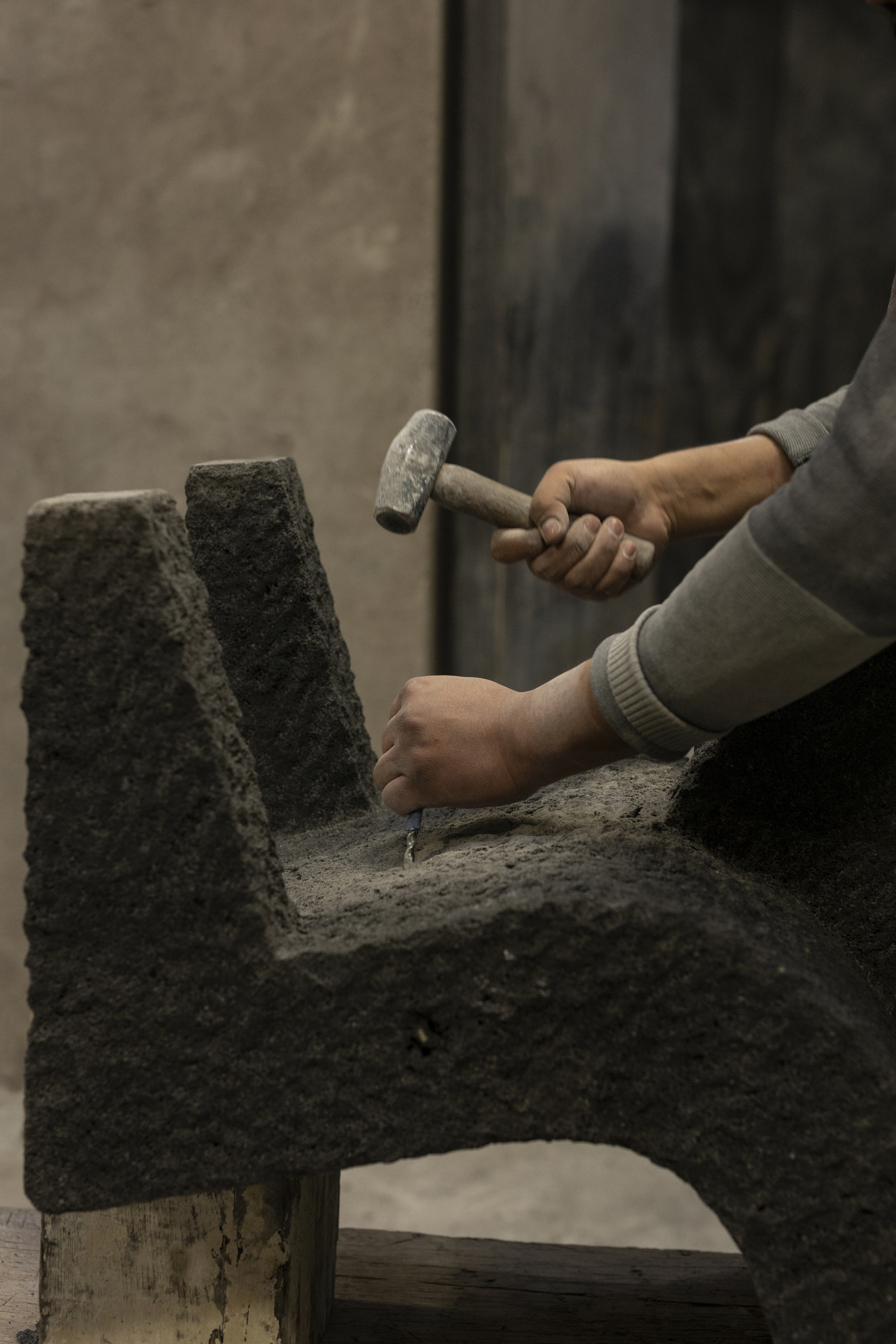 - Pedro Reyes making Metate Chair. Courtesy of OMET