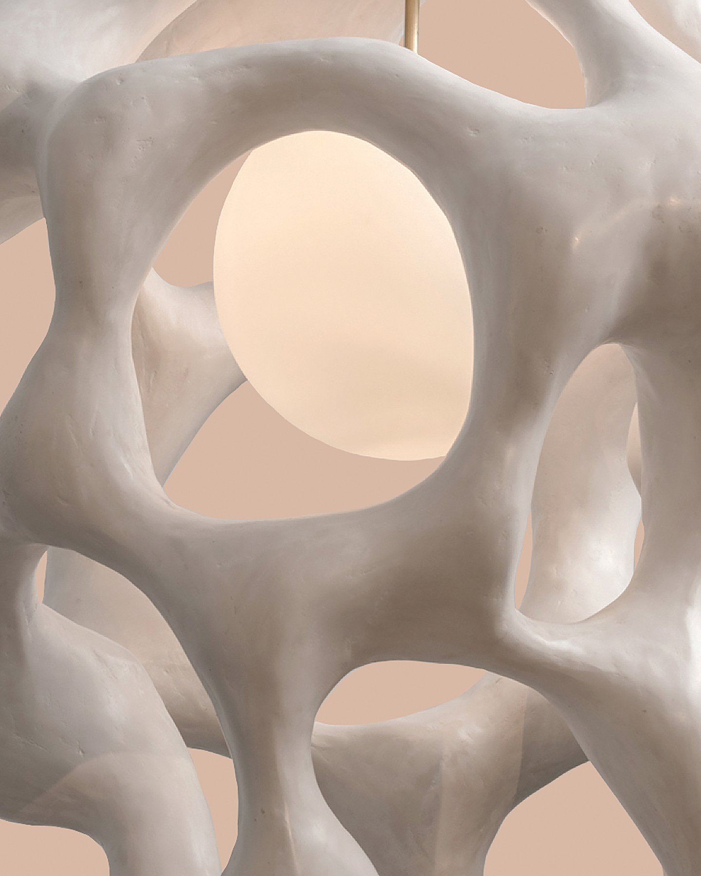 The Amobius illuminated sculpture by Rogan Gregory (2022) is made of white gypsum, its delicate form recalling the body and human processes. Rogan’s work is largely inspired by abstract forms, geology, humans’ impact on nature, and the processes of life.