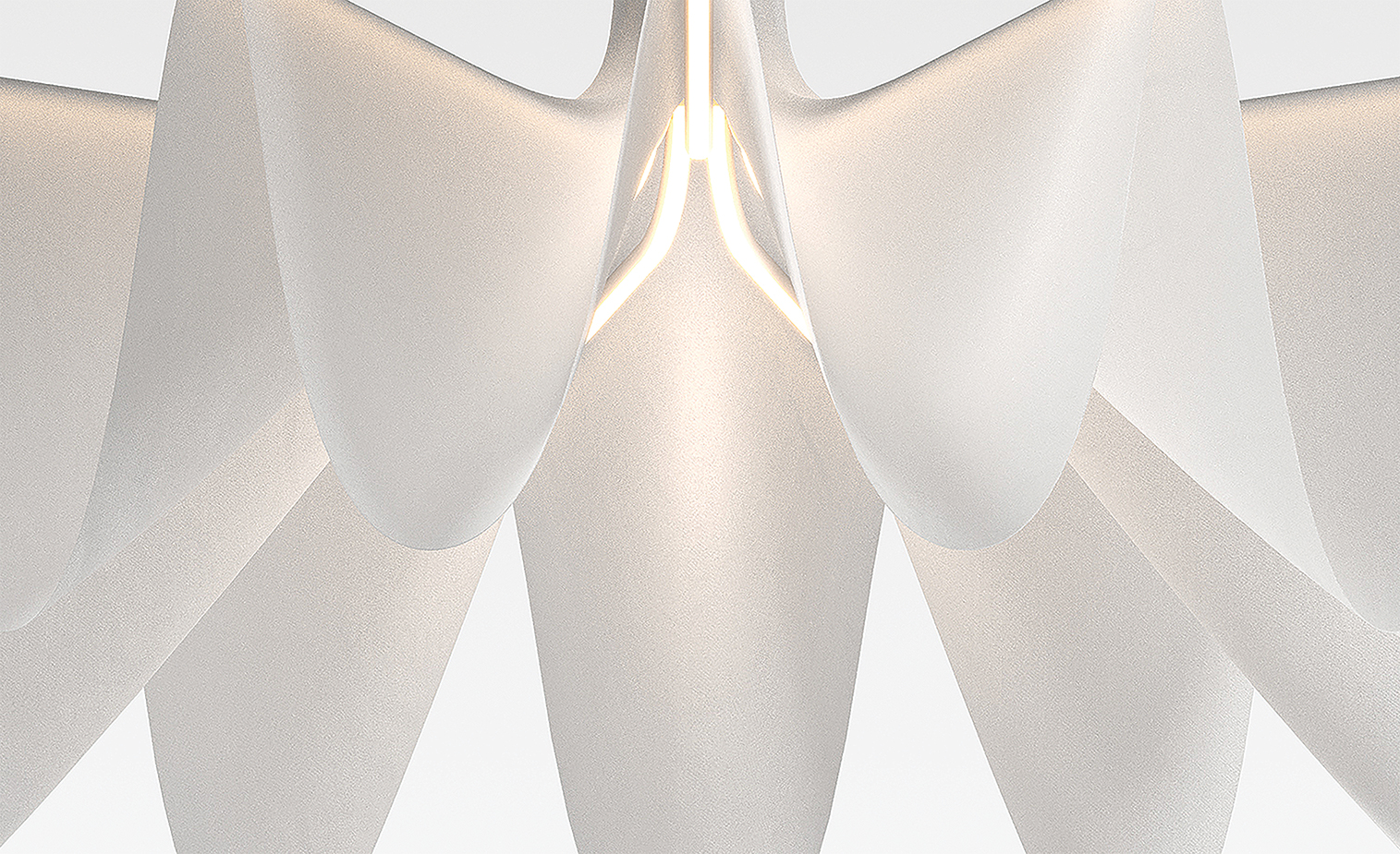 The Bjarke Ingels Group designed Veil for Artemide (2022) with an 11-arm structure and an elegant diffuser that drapes over the illuminated arms. The diffuser is made of natural fibers, chosen for their aesthetic characteristics and sustainability.