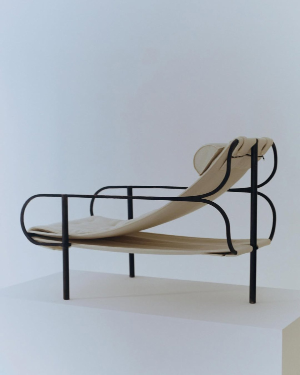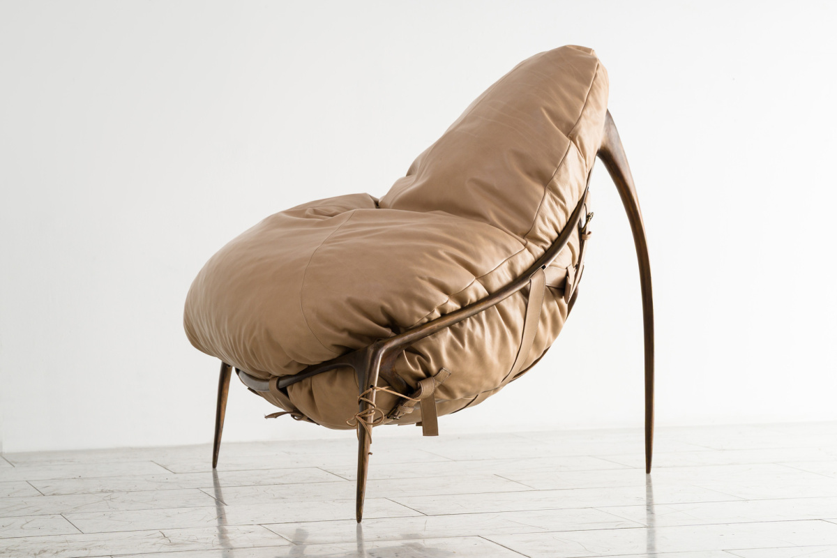 The Paris based duo extends their ongoing research into metal “skeletons” draped with padded, body-like forms developed into low slung, surprisingly comfortable lounge chairs.