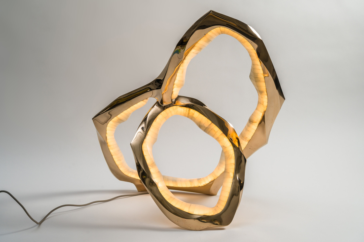 Alongside it, Markus Haase’s metamorphosed Circlet appears as a table or floor lamp, its looping form and meticulously worked surfaces showing a refined command of material and finish that turns technical innovation into something soft and luminous.