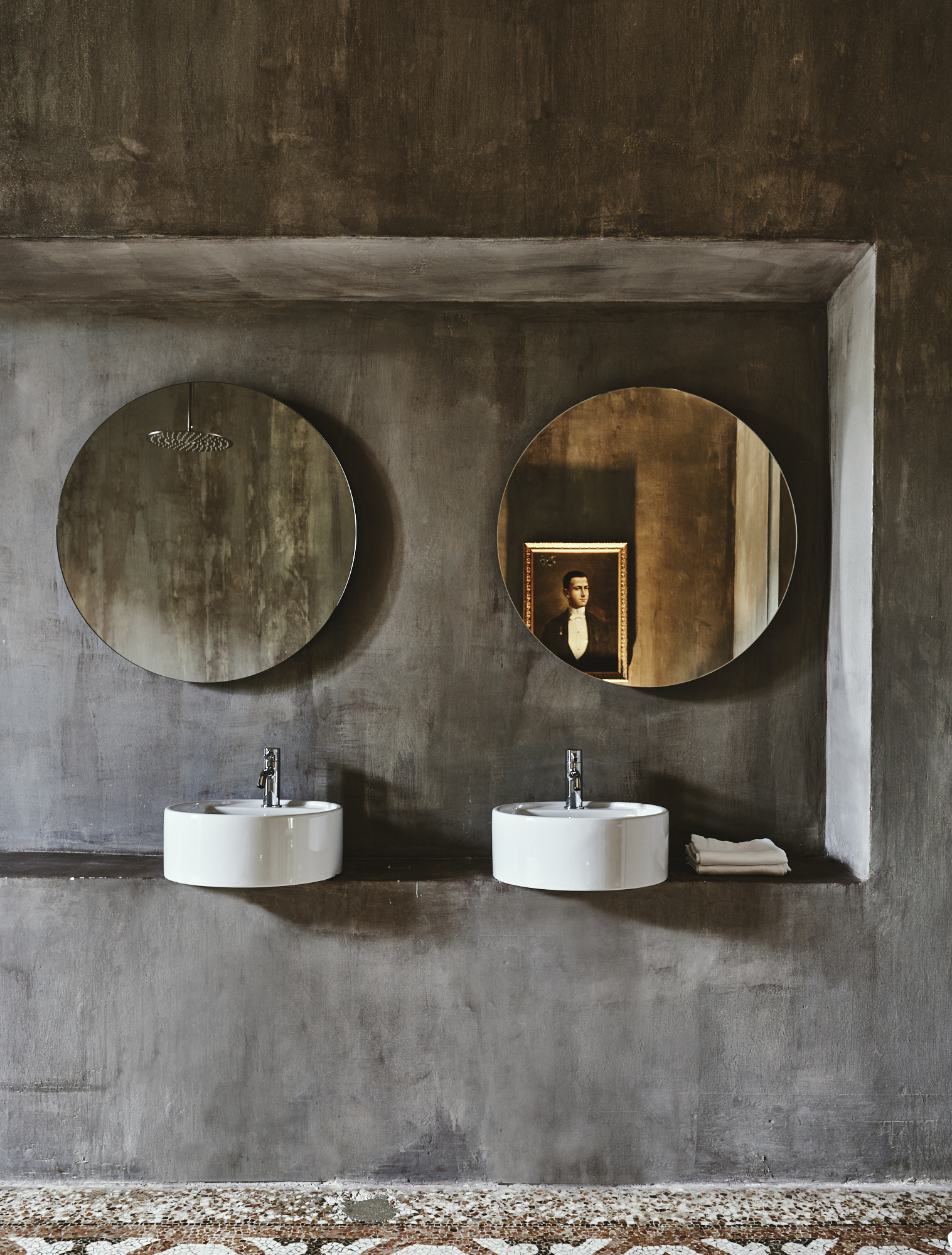 In the bathrooms, a shower installation designed by Andrea Sala features an archaic water source that rains into a large basin from the 6-meter high ceiling.