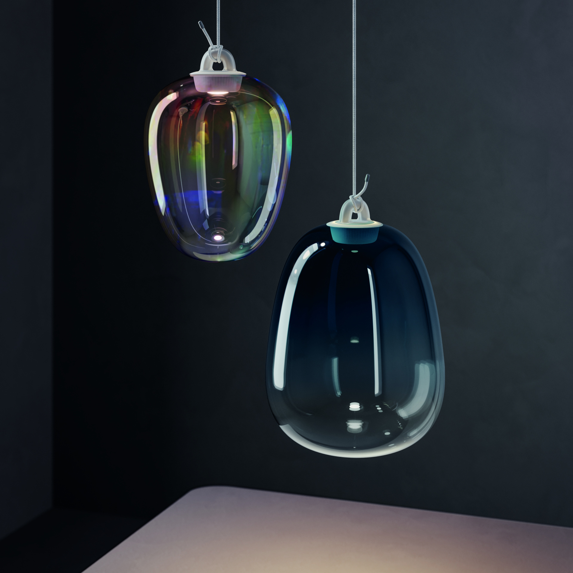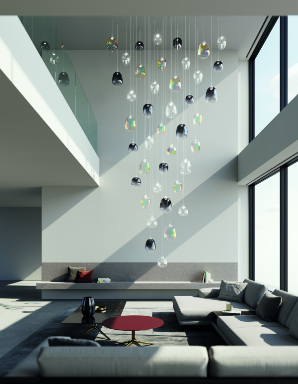 “Lodes knew how to add a little color to the glass, so we experimented with the idea,” she says. “One version of Oblò is clear, and another has a drop of black. Really it’s almost transparent, but the black creates a bit of a shadow layered over the light. The other one is iridescent, like a rainbow.”
