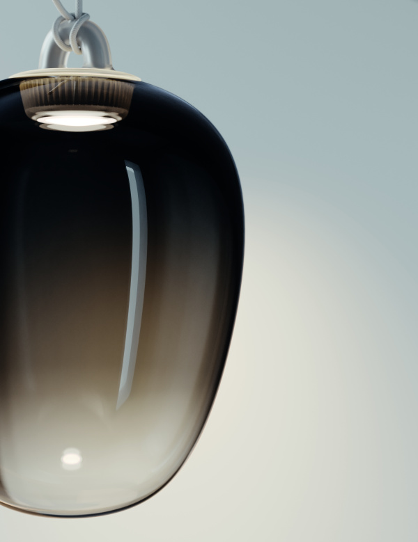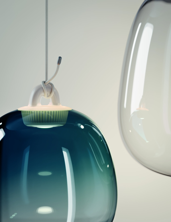 - Paola envisioned the light’s shape to mimic the weight of the glass, with one design featuring a curved form that appears nearly oval, yet with one side flatter than the other.
