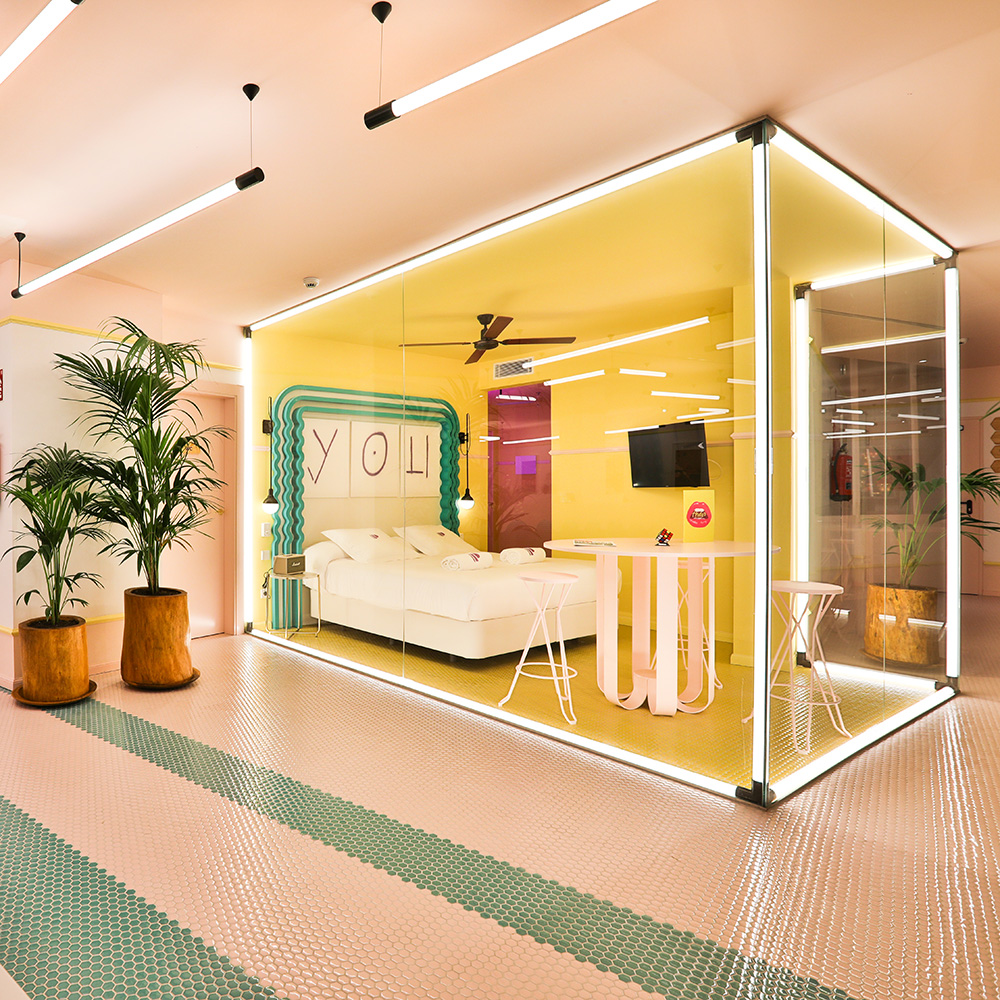 From the moment you walk into Concept Hotel Group’s Paradiso Ibiza Art Hotel, in Ibiza, Spain, your senses kick into overdrive—especially your sense of sight. With design elements that harken back to your favorite arcade (think neon and even a thoughtfully placed pinball machine) and colors reminiscent of sherbert, Ilmiodesign transformed the area into a hub of activity that’s both playful and warm. Here you’ll find not just high-end accommodation, but also art exhibits, a live music venue, and even a tattoo parlor. “The concept was the world of art,” says Diego Calvo, CEO of Concept Hotel Group. “We wanted it to be an artistic hotel with a continuous artistic show.” Paradiso Ibiza opened in the summer of 2018—a retro chic oasis colored in pinks, purples, and greens and set against the Mediterranean Sea on the main street of San Antonio Bay.