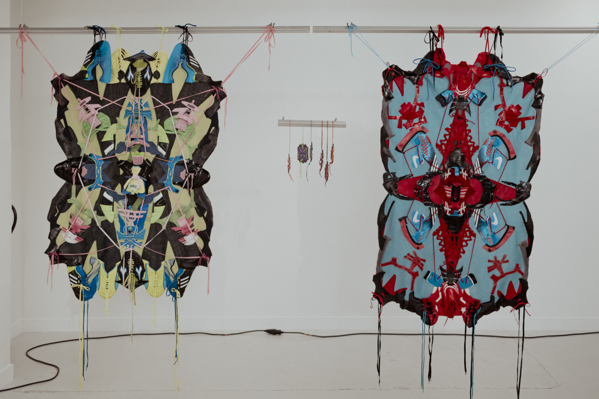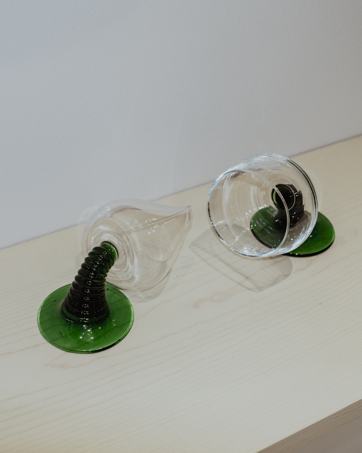 On a nearby plinth sits a cluster of distorted drinking vessels from the duo’s Fan Collective, each one a riff on the patterned glassware found in many grandmothers’ cupboards across southern Germany and France. The pieces began as ready-mades that were heated until they slumped, turning the familiar into something oddly ceremonial.