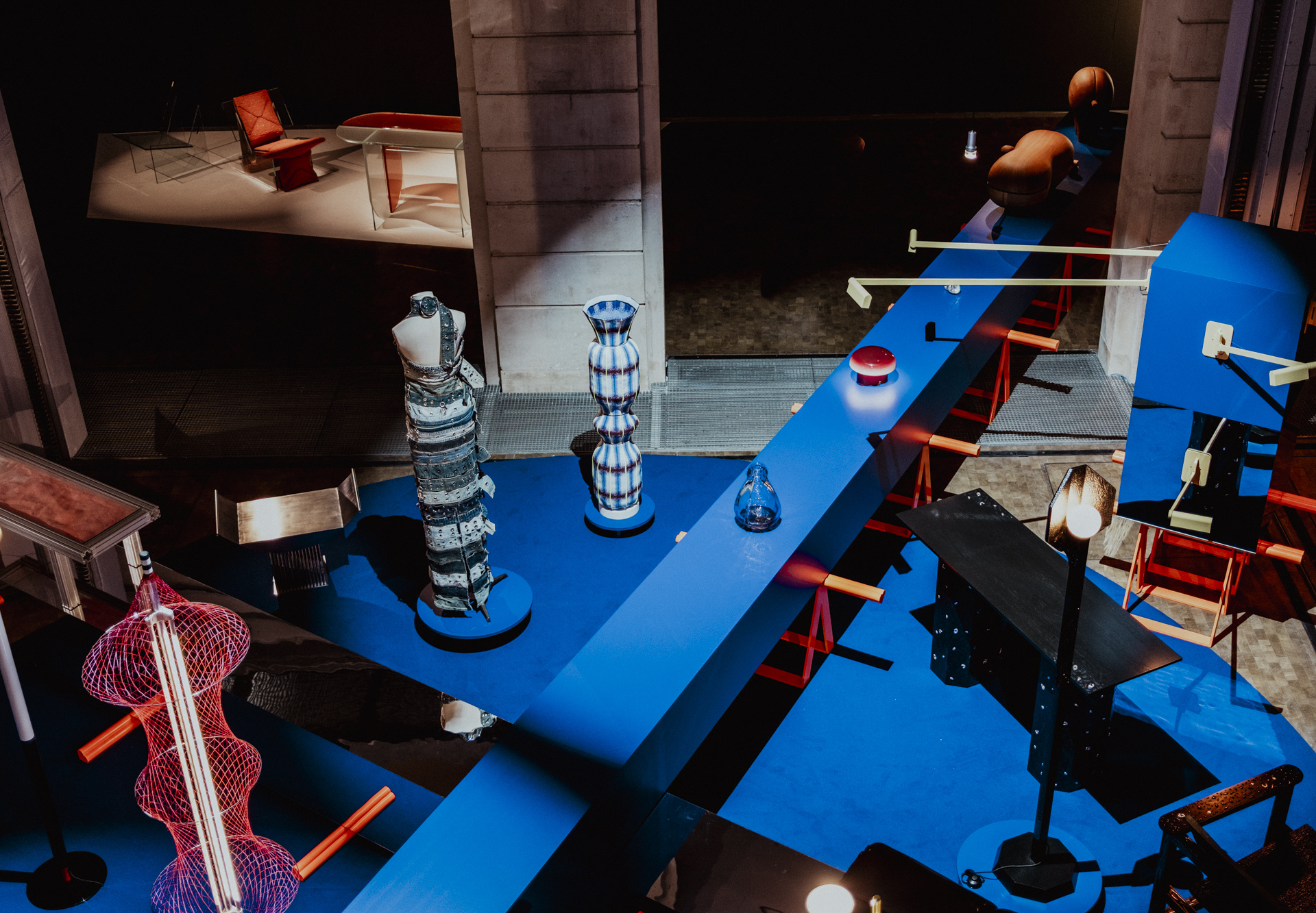 At the center of the exhibition sat a large X made of reflective chrome steel, a deep matte-blue cross, and bright orange sawhorse topped with lighting and objects. Christopher told me it was modeled on a clock and working with a lighting designer, he set a beam to sweep a full rotation every minute. Around it experimental fashion, aluminum furniture, and sculptural pieces in new materials were intentionally jumbled, which made the room feel active and readable rather than staged. Jeanne-Léopoldine oversaw the fashion component. Extraordinarily well done.