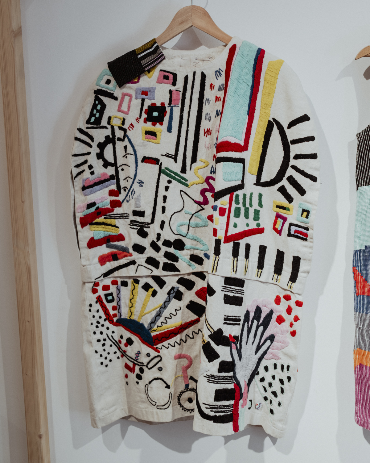 - Graphic jacket by MEÜS, created with London textile designer Nelly Rose and artisan cooperatives Chuwila, Las Rosas, and Adiba.