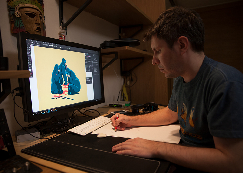 Everything that surrounds me inspires me. Music, travel, my city, my family, my friends, and—of course—my wife. I love music and listen to it very often. A long time ago I discovered the British [synth-pop] duo Pet Shop Boys and the Russian band Kino, headed by Viktor Tsoi. These two groups especially inspire me. I have to admit that Pet Shop Boys not only delighted me with their music, but also with their album artwork. They have an amazing graphic designer and, to some extent, the duo have taught their fans good taste. I also listen to a lot of other music: The Cure, Chemical Brothers, Bowie, U2, Daft Punk, Tears for Fears, Beastie Boys, The Verve, Fatboy Slim, R.E.M., and many others. I also write music, and it also inspires me to draw. These are interconnected things.