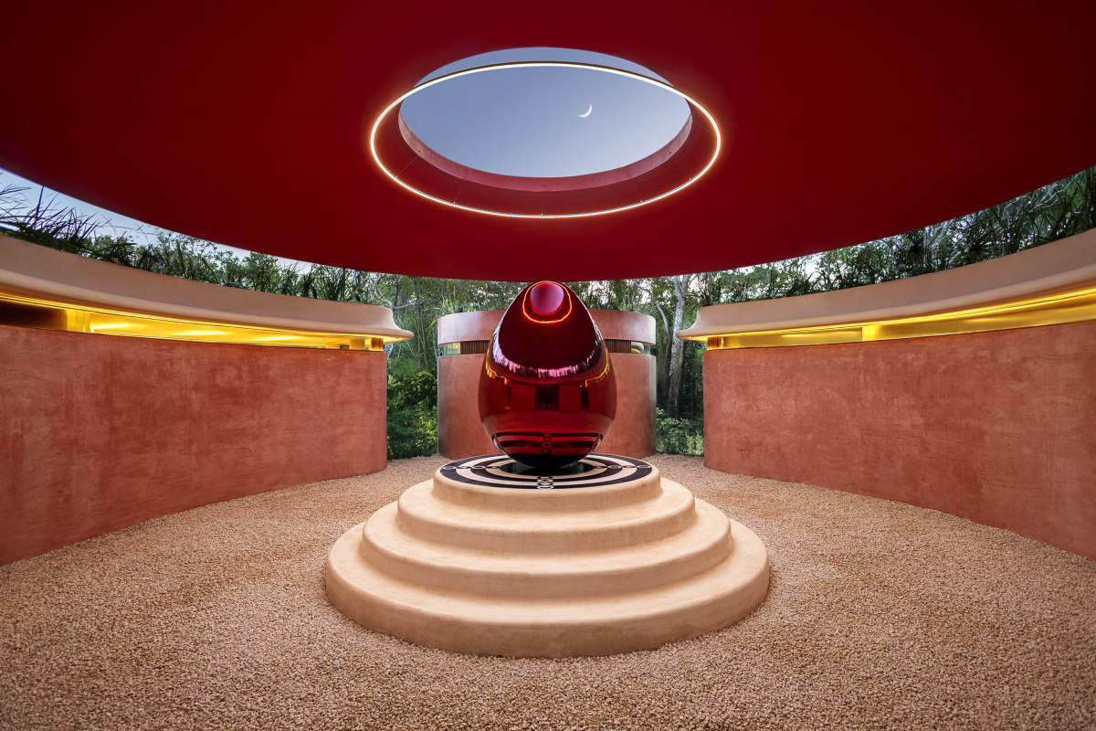 One of Pilar’s permanent installations at Faena Tulum, “Portal del Éter Rojo,” is inspired by ancient Tattwa symbols, focusing on the element of ether (akasha), represented by a red egg. The egg symbolizes akasha—the cosmic essence of space and spirit—while the color red evokes fire, a dynamic force of creation and manifestation. Photo courtesy of Pilar Zeta