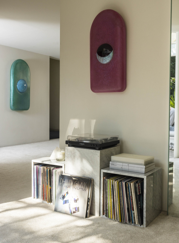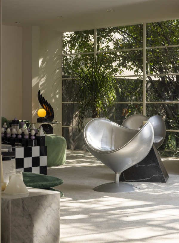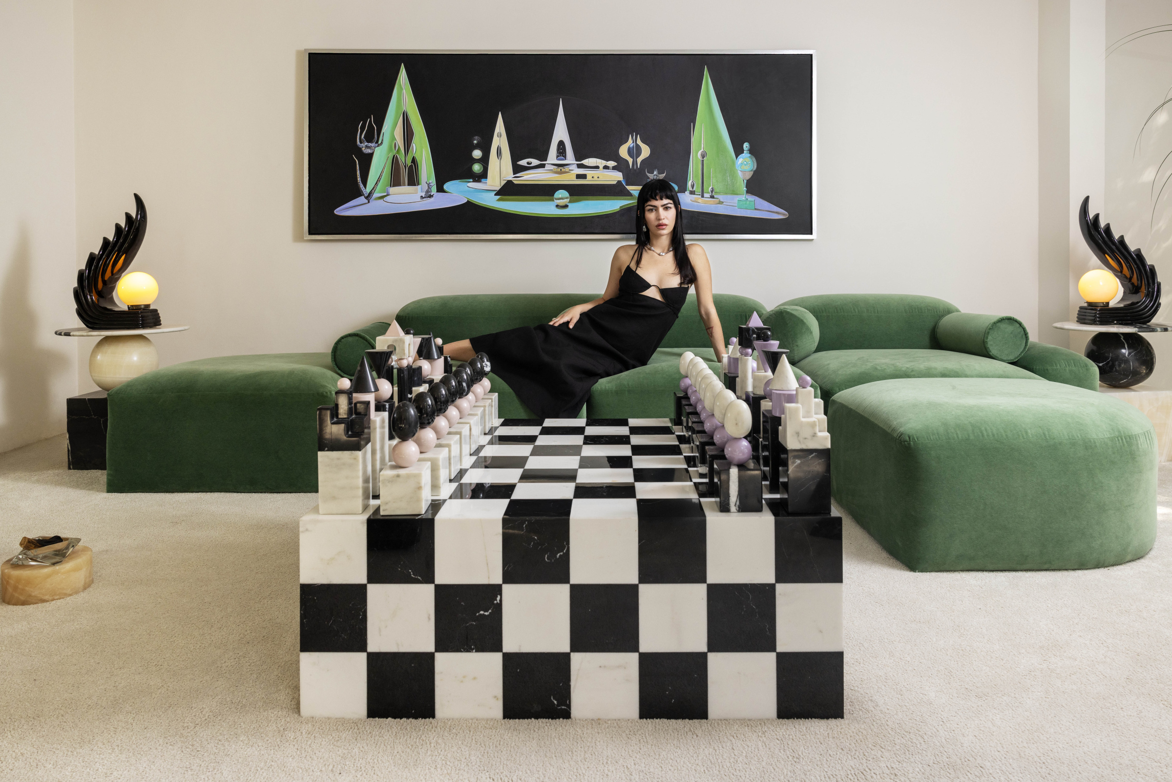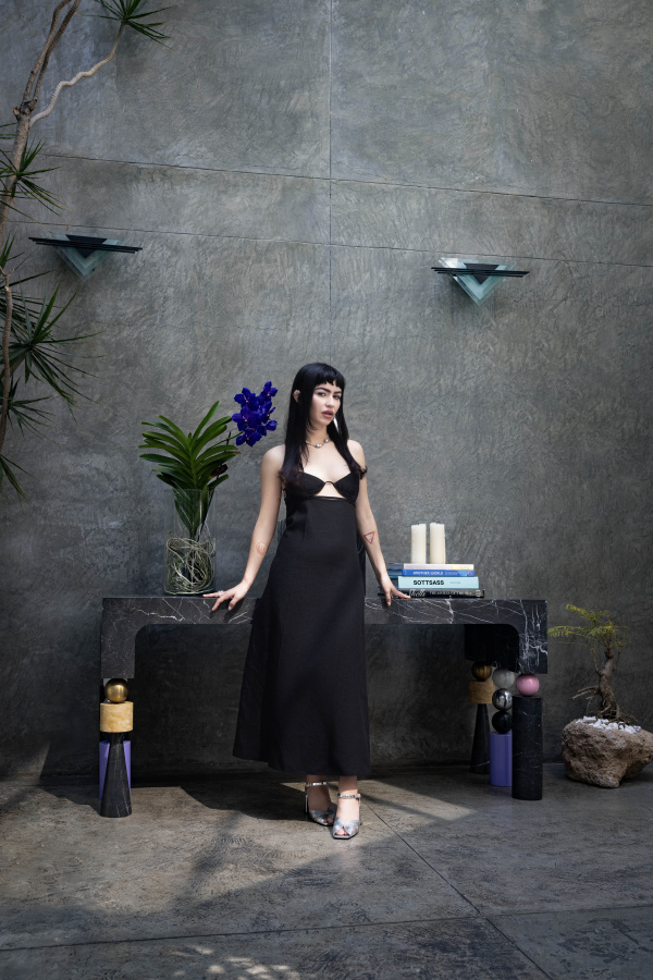 This marble table is one of the first pieces Pilar ever made. “The top weighs over 1,000 pounds,” she says. “It was meant to be a desk for upstairs, but it was just too heavy to move. I left it here at the entrance. I love it because it’s like a portal. I thought, ‘OK, I’m going to use it to create a portal of creativity.’” Dress by Gucci, shoes by Suzanne Rae, jewelry by Varon