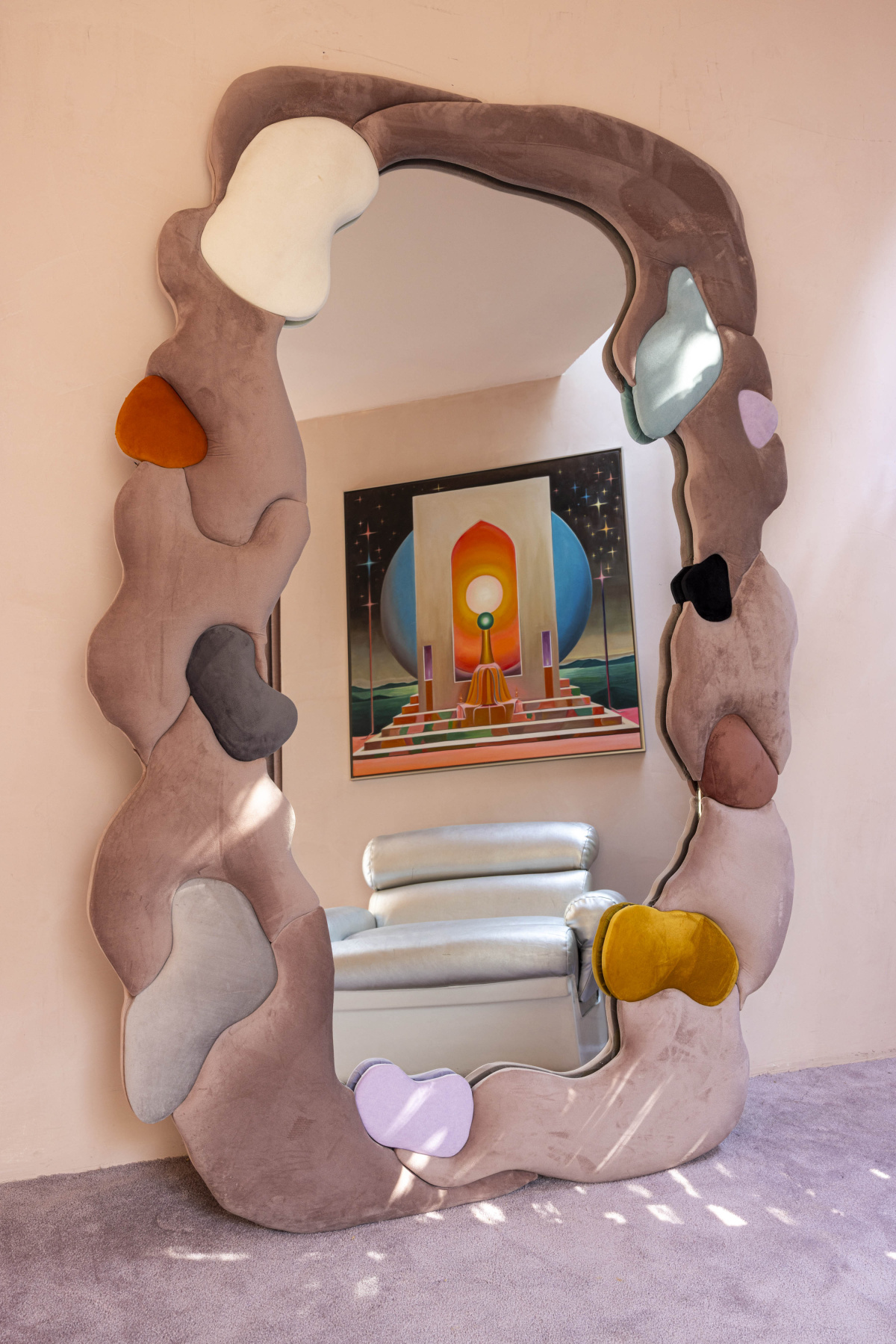 - Pilar’s bedroom features “Orange Flame,” one of her earliest digital works turned oil painting, alongside her Espejo & Cama Hongo mirror and bed, a recurring motif in her art.