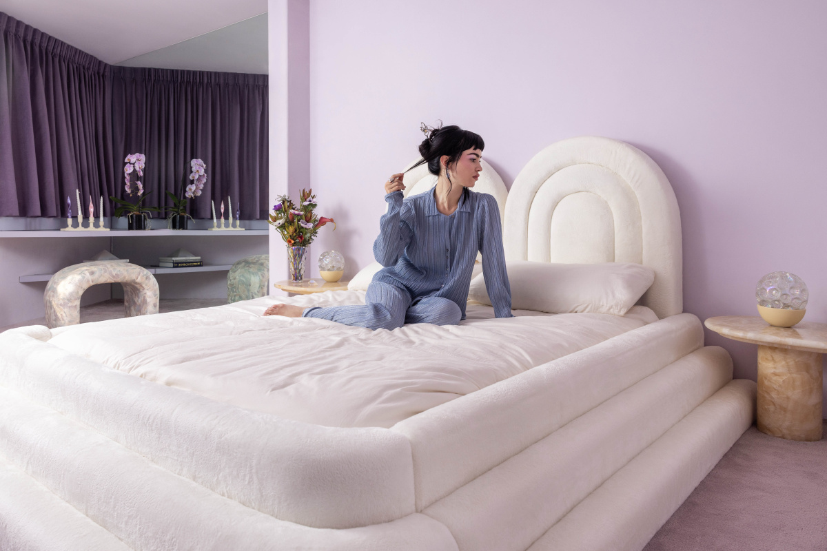 “This room is a meditative room for my guests. I wanted the space to feel soft and calming, almost like a cloud,” she says. Vintage pajama set, bed by Cama Portal