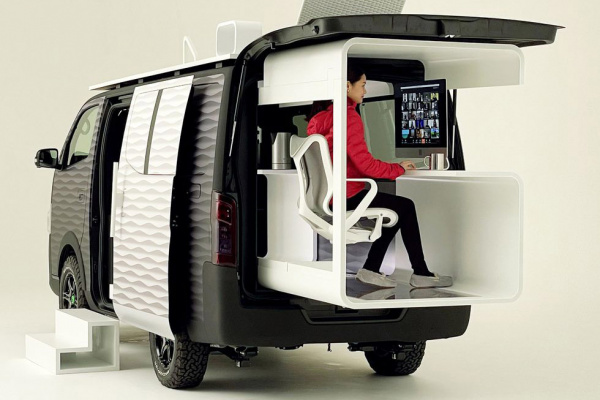 + Called the NV350, the van is retrofitted with a smartphone-controlled retractable workspace that extends out the back of the van and into nature.