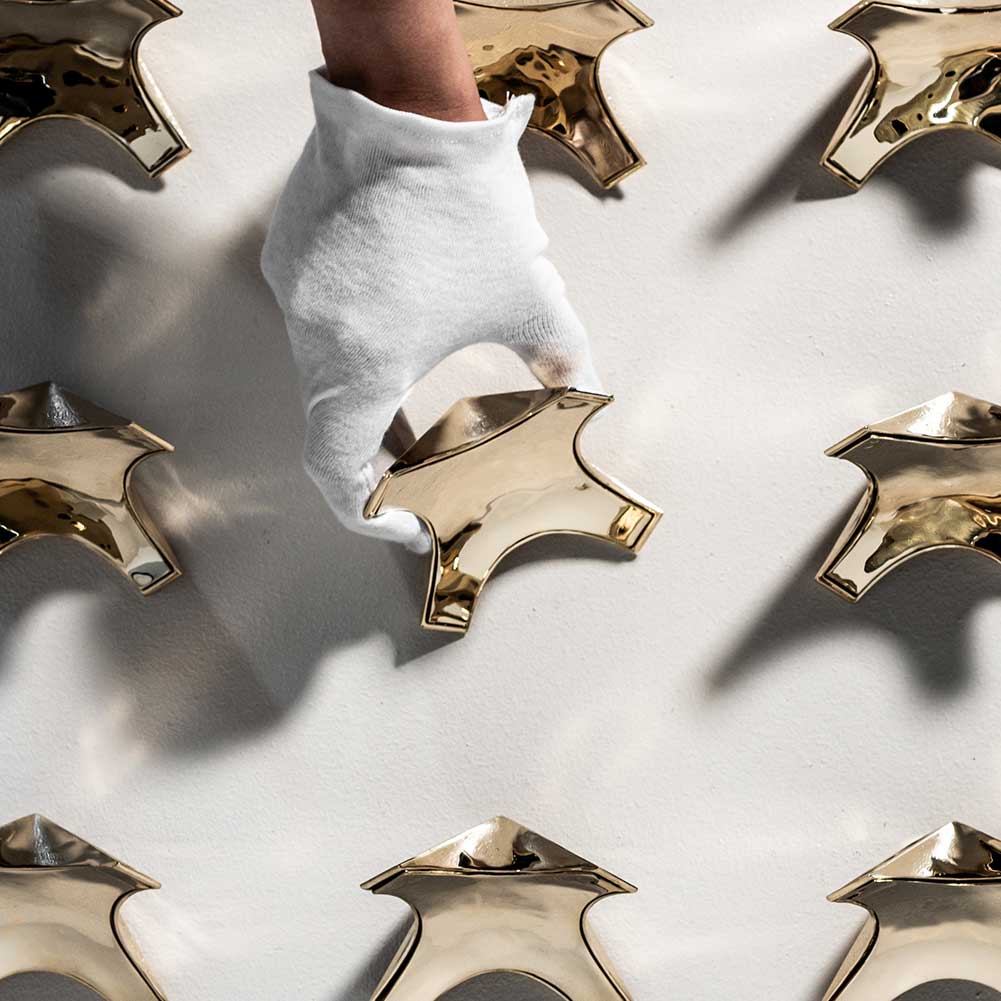 An example of this in action is Stickbulb’s X connector—a cast brass piece with concave detail that beautifully reflects light and holds four sticks together. In creating it, a world of possibilities was unlocked. “It creates a whole world of geometry—our Truss collection, Boom collection, a small side table called the X Table, our Triple X Chandelier,” Chris says. “When we first conceived of the X connector, it was for one set of fixtures. We realized it had this potential to make all these other geometries because we literally create little toy versions of all of our fixtures. We have tiny little connectors we can throw out on a table. We have tiny little measure sticks, and we play with them like Erector Sets and see what we can come up with.”