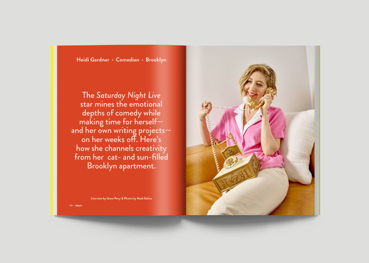 This issue also took us into the DUMBO apartment of Saturday Night Live cast member Heidi Gardner, where we talked about SNL’s grueling creative schedule, how the pandemic halted it, and how Heidi has benefited creatively. “A lot of the writers I collaborate with, who are women, are like, ‘Hey, do you want to meet to pitch ideas around noon rather than midnight?’ Yes! I’d love that!,” she told us. “I don’t think I’m a genius when I’m dead-tired, and I’m just better when I’m on my natural rhythm. I’m not trying to be Jim Belushi.”