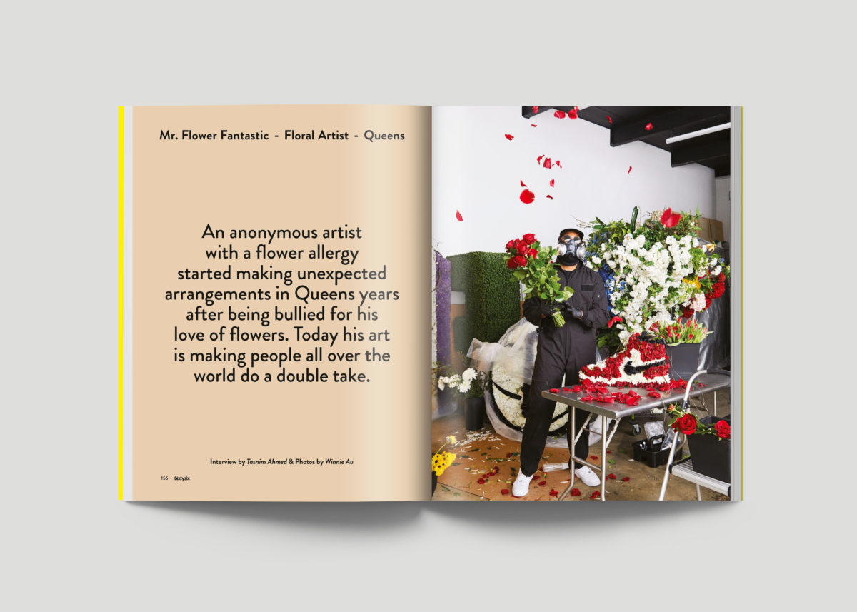 Opening this issue is Mr. Flower Fantastic, the anonymous multidisciplinary artist turning pop culture icons—think Nike sneakers, KAWS, a Kobe Bryant jersey—into elaborate floral sculptures. But what we didn’t know before we met up with MFF—besides his true identity, which we still don’t know—at his Queens studio is that some of his most well-known creations were born from trauma. Now he uses flowers as a way to communicate happiness. “I take great joy in knowing my work is appreciated by someone who grew up in places where flowers don’t grow,” he says.