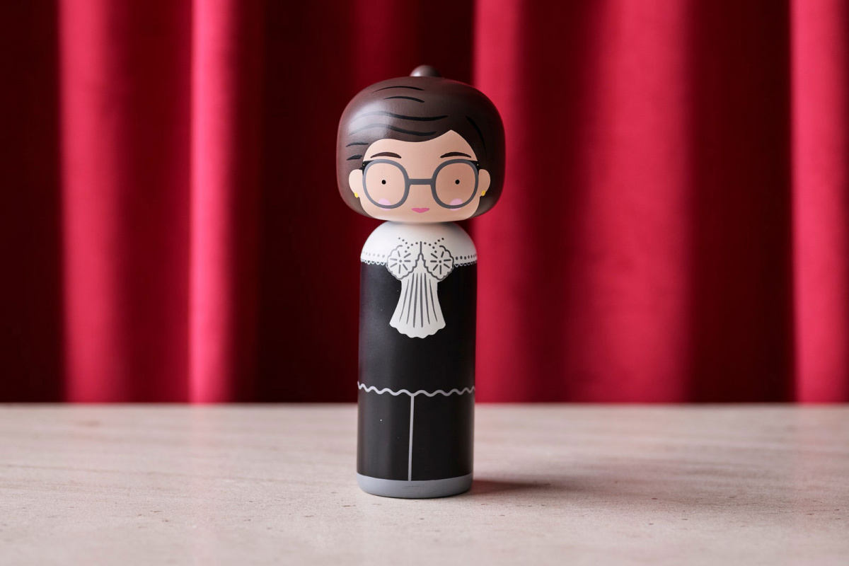Danish design collective Lucie Kaas memorializes Ruth Bader Ginsburg with Kokeshi Doll for International Women’s Day.