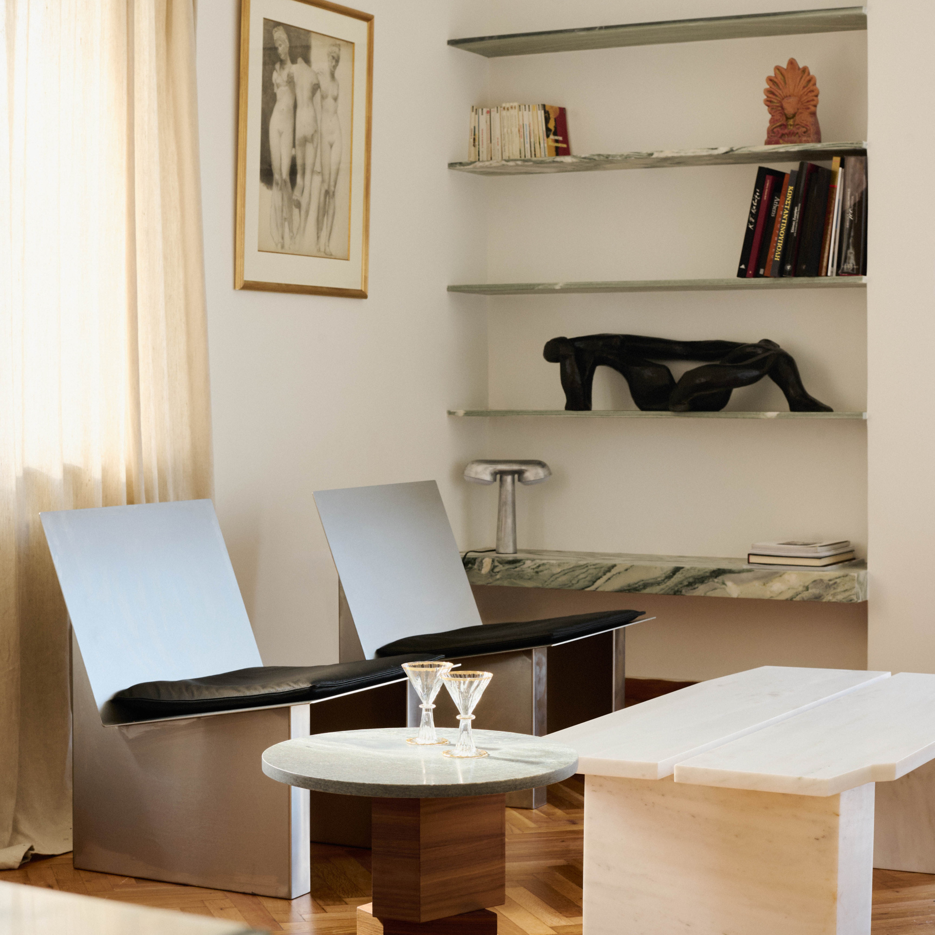 Elena Alexopoulos: We draw heavily from Greek architectural and artistic tradition, but our approach is to interpret it in contemporary ways rather than simply reproducing historical forms. For example, the living room table has these tubular metal legs that directly reference the columns of the Parthenon.