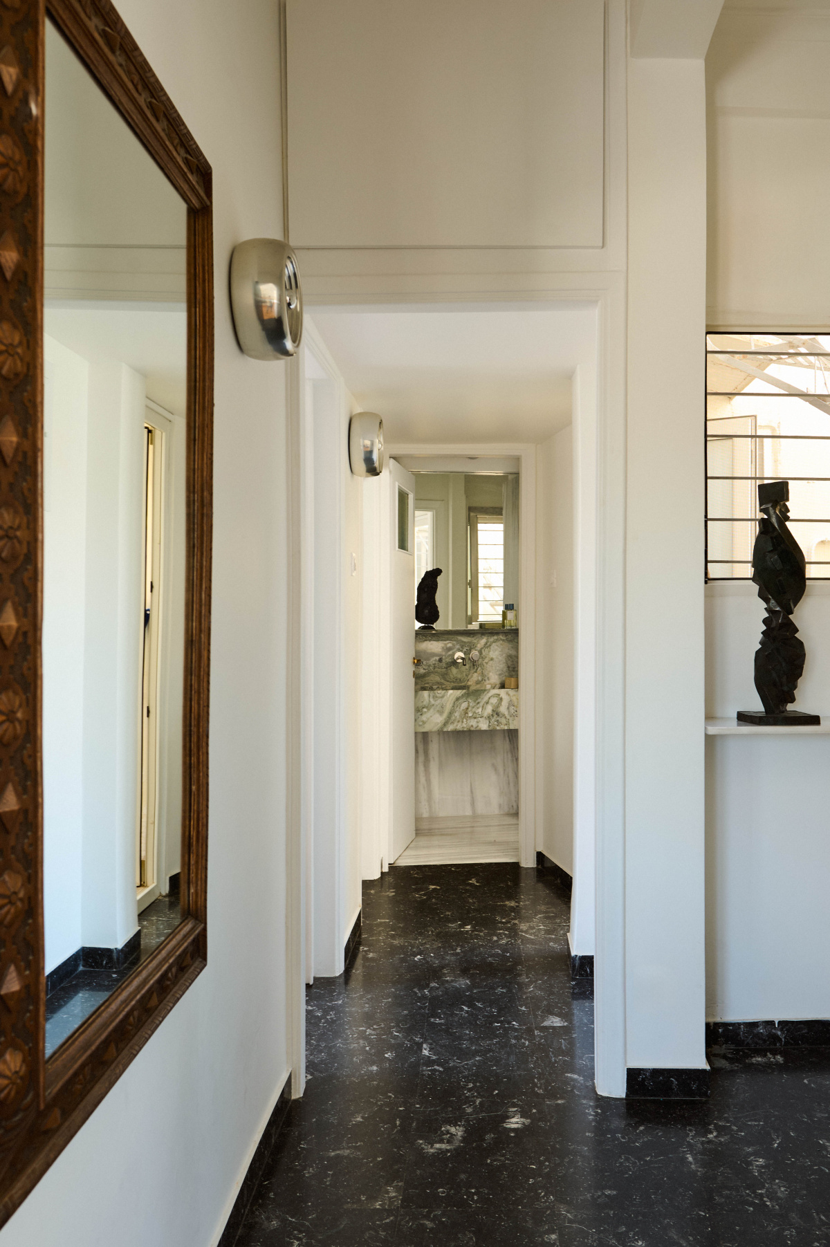 - Original marble flooring from the building’s 1950s construction leads through the hallway.