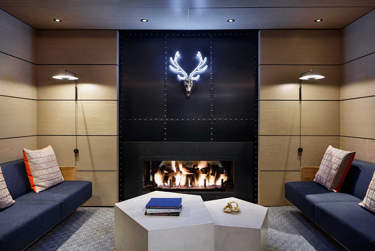 For the Limelight Hotel Snowmass, near Aspen, the design team looked to juxtapose comforting earth tones with colorful accents—like the neon antlers that overlook gray pentagonal tables below. COURTESY OF STONEHILL TAYLOR.