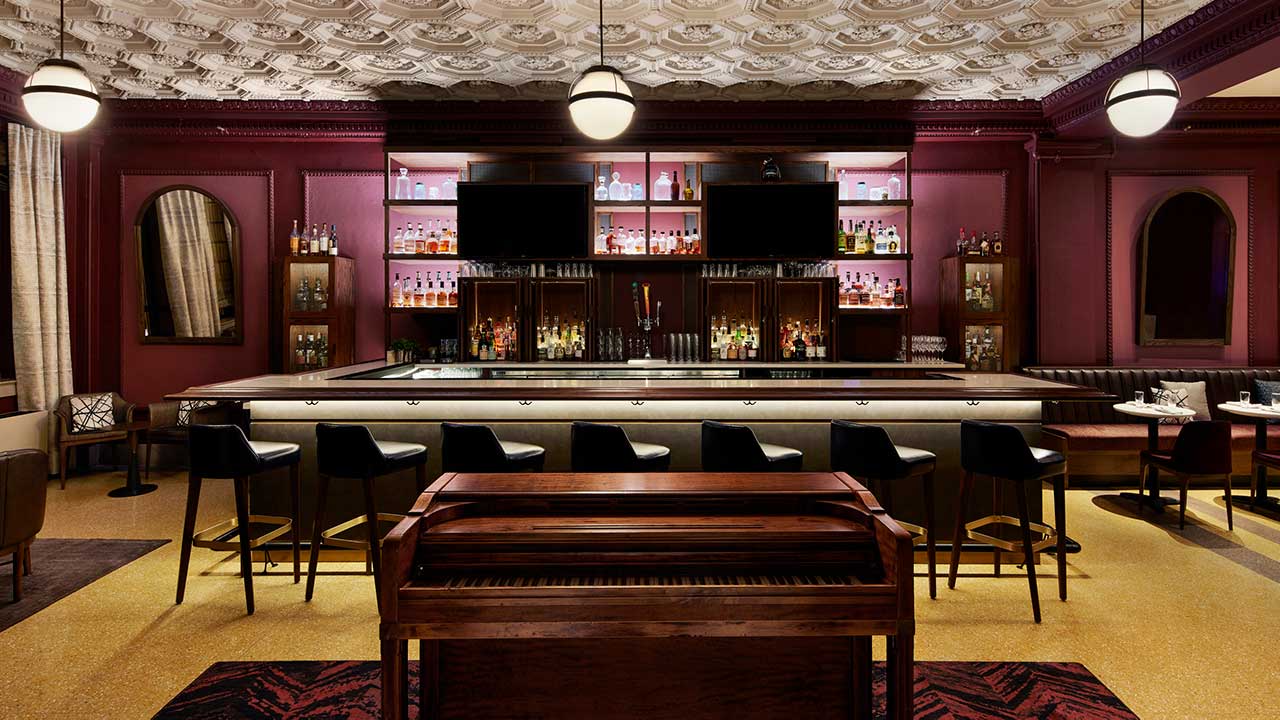 At Bar Tenn, inside the Holston House hotel in Nashville, a repurposed vintage piano anchors the space and also provides guests a spot to rest their drinks. COURTESY OF STONEHILL TAYLOR.