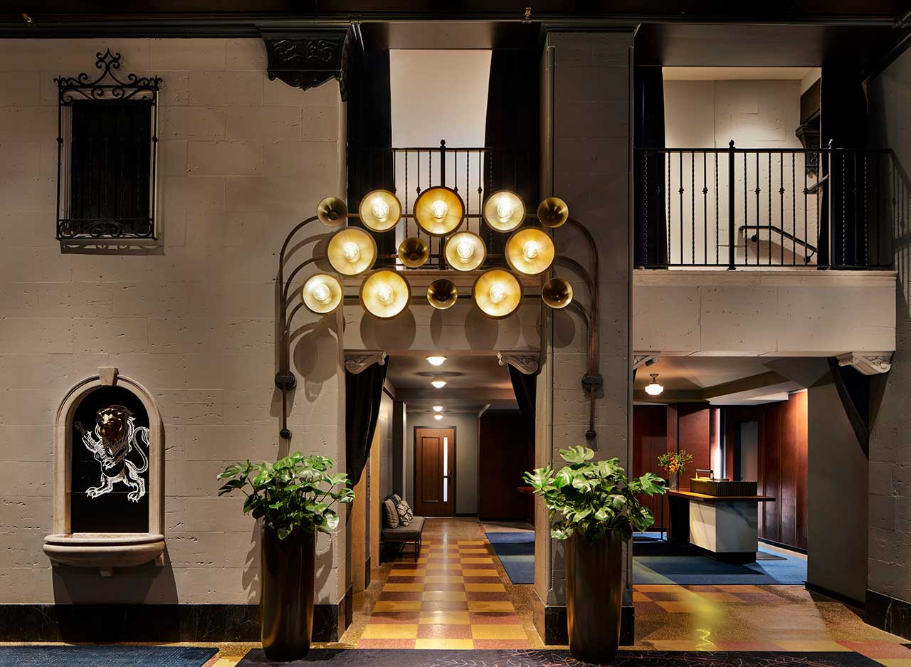 - Leather furnishings and terrazzo floors feature prominently at the Holston House lobby…. COURTESY OF STONEHILL TAYLOR.
