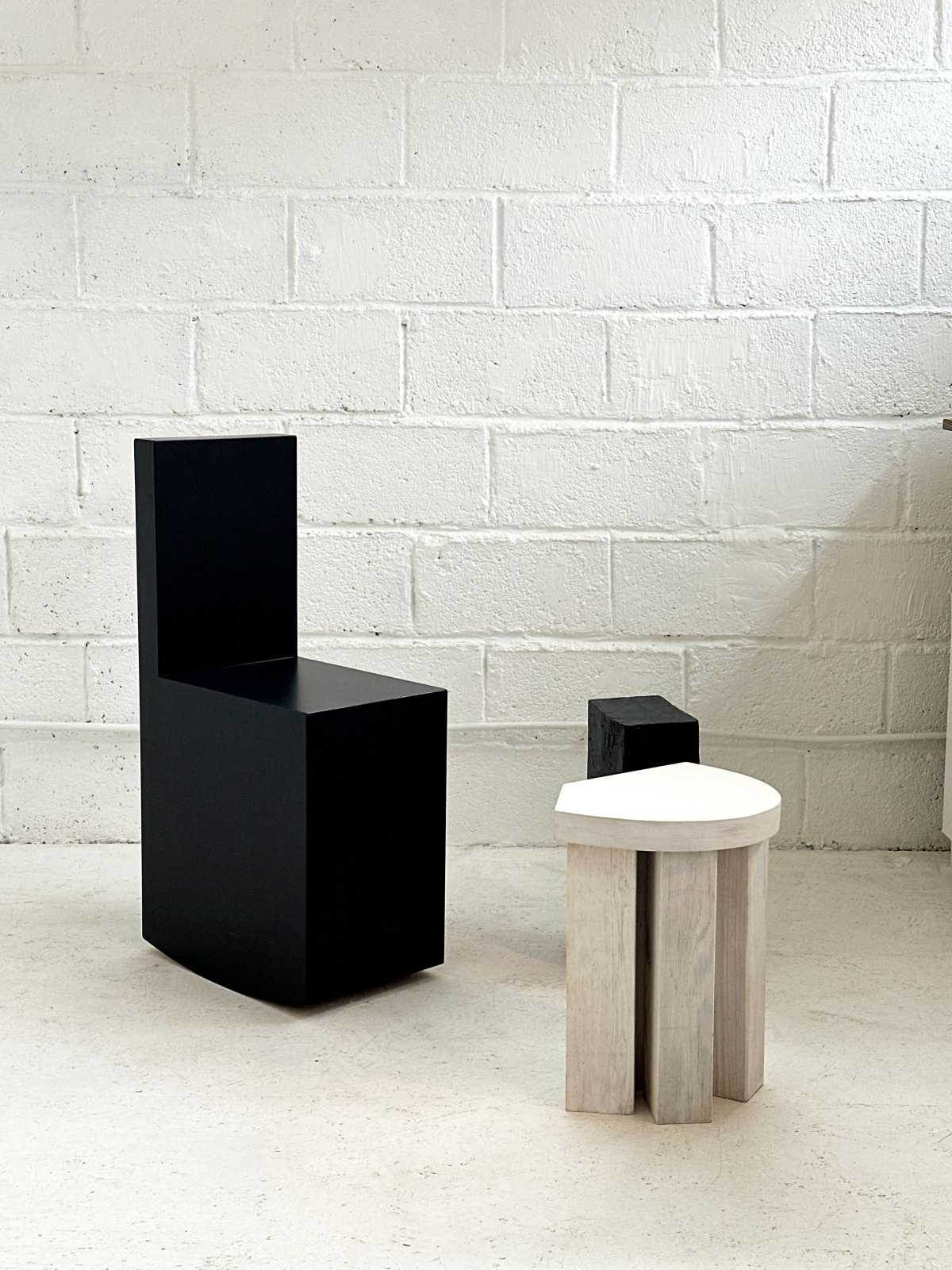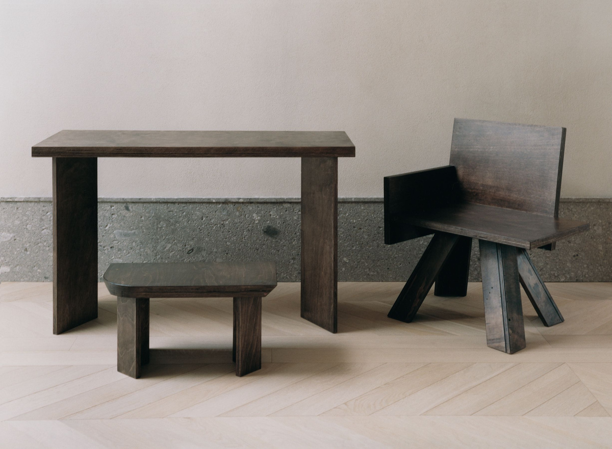 “Because of how we work, the design process can be incredibly fast—sometimes it takes just a few hours and we’re ready to move forward. But we always ask ourselves if it’s ‘Goons.’ Is it really right? Is this the best version of it? If it’s not, we’re okay with starting from scratch. Refining the design as we go is also a big part of the process, and that’s the enjoyable part.” Above: Brace chair, AC, and stool, and Five-Points console and table