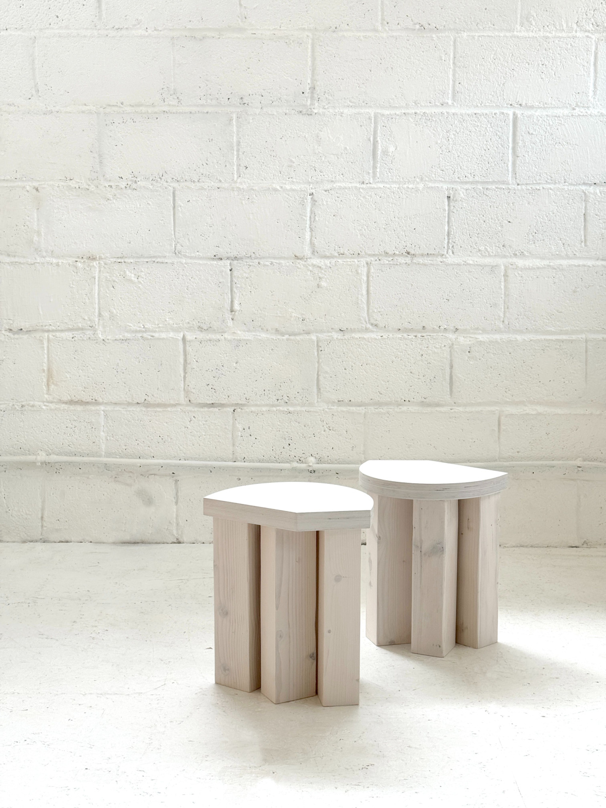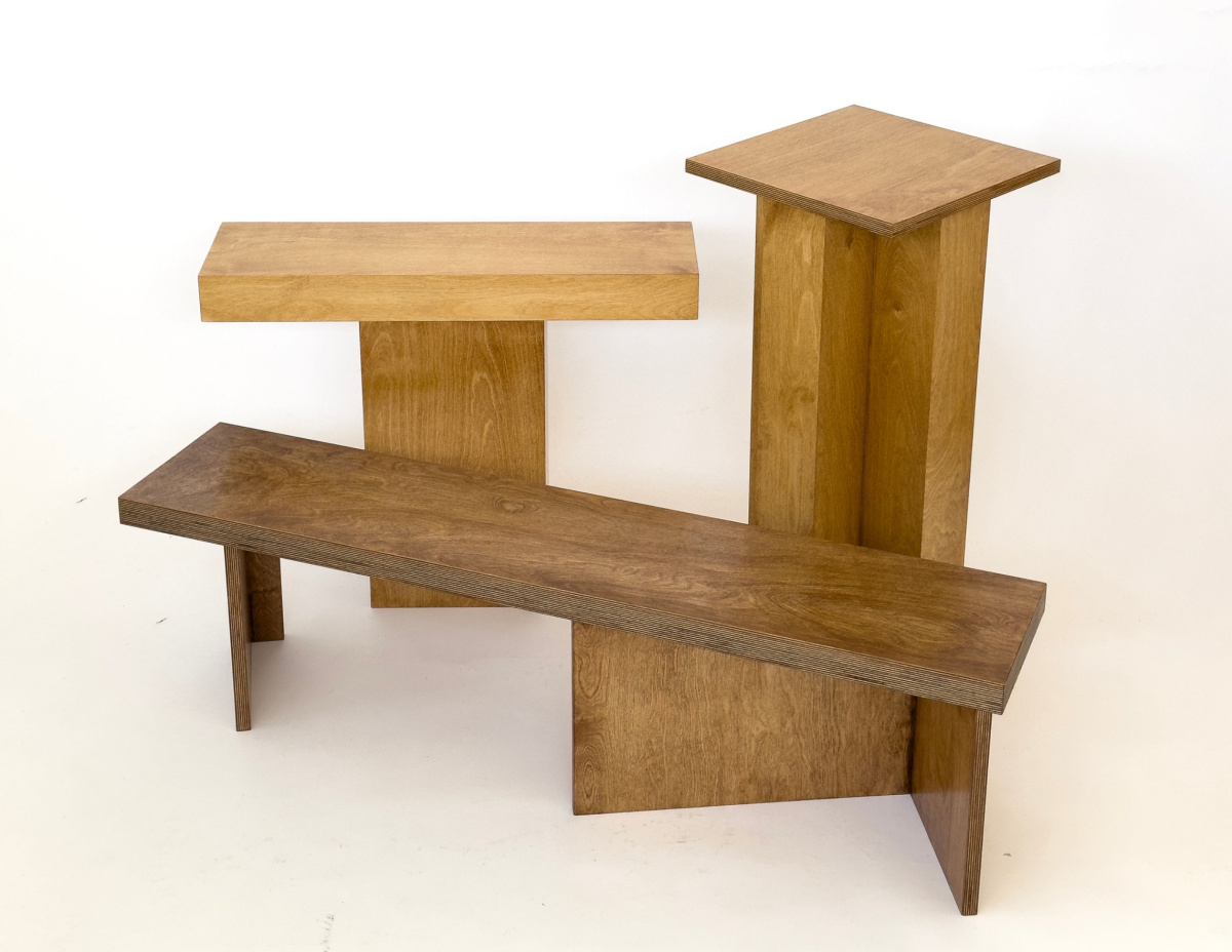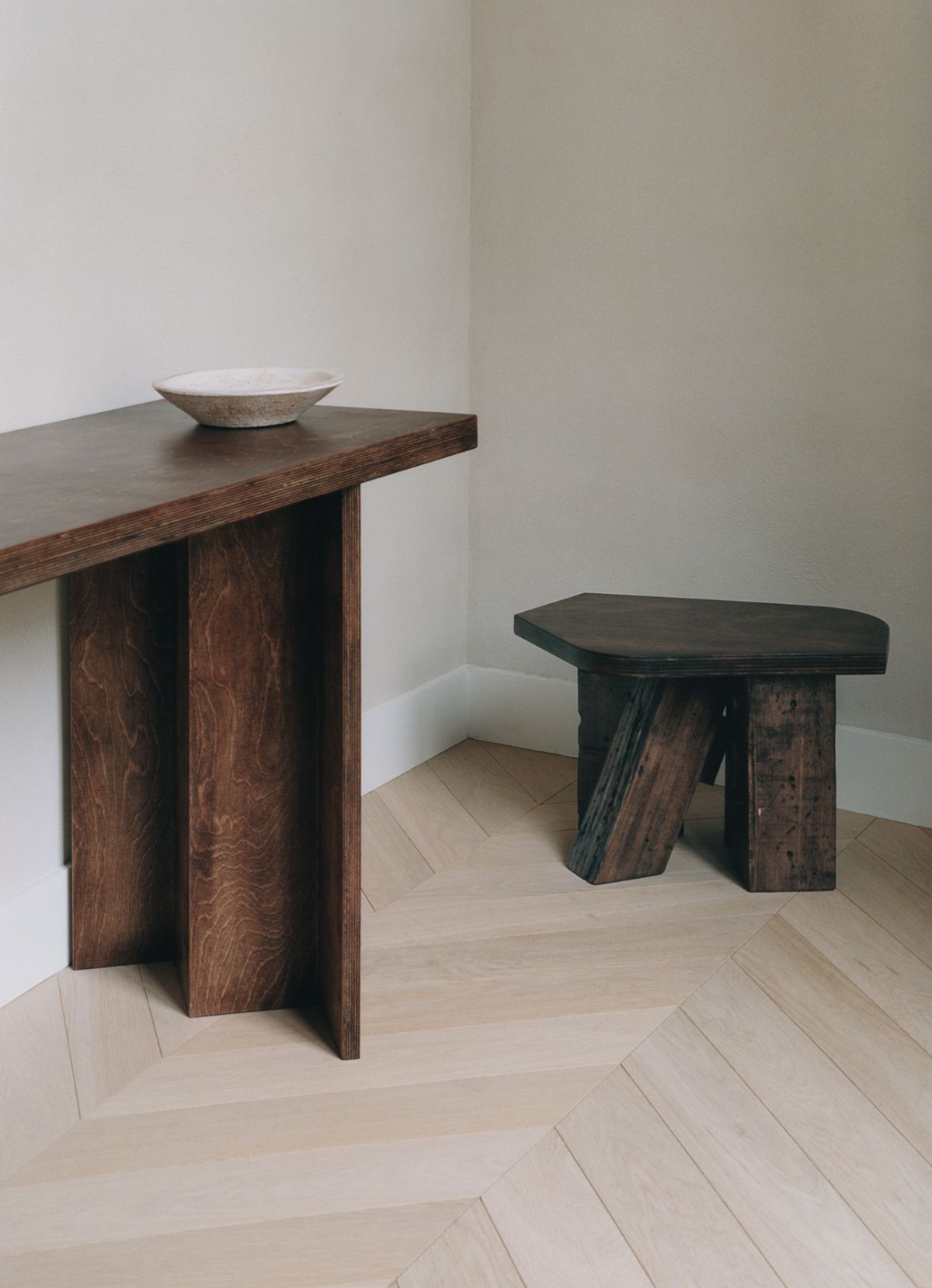 - The tall Entry column on the right came to be during a photoshoot in the Goons studio. “We had random pieces of wood lying around, and Mia just kind of stacked them and put a piece on top as a component of the photoshoot. Afterward we were like, ‘we have to make this’ and glued it together exactly as she posed it.” Back left: Truss console. Front: Freeplan bench