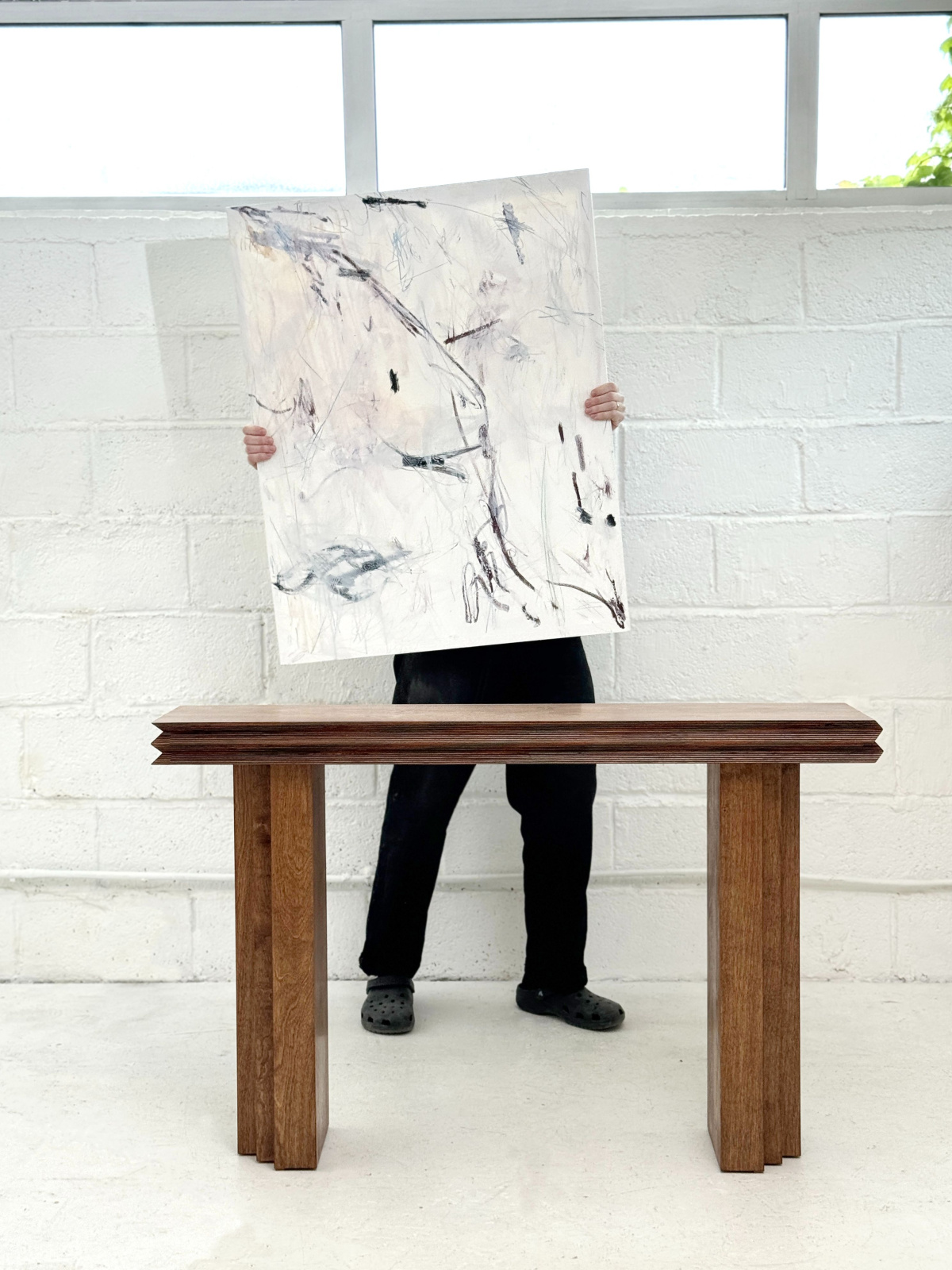 - “The M console table design was actually an accident,” Mia says. “Paul had a lot of pre-cut wood laying around in the studio. I walked in to get something and saw the way he stacked some of the wood. I thought it looked really great! I took photos of it and we ended up developing it.”