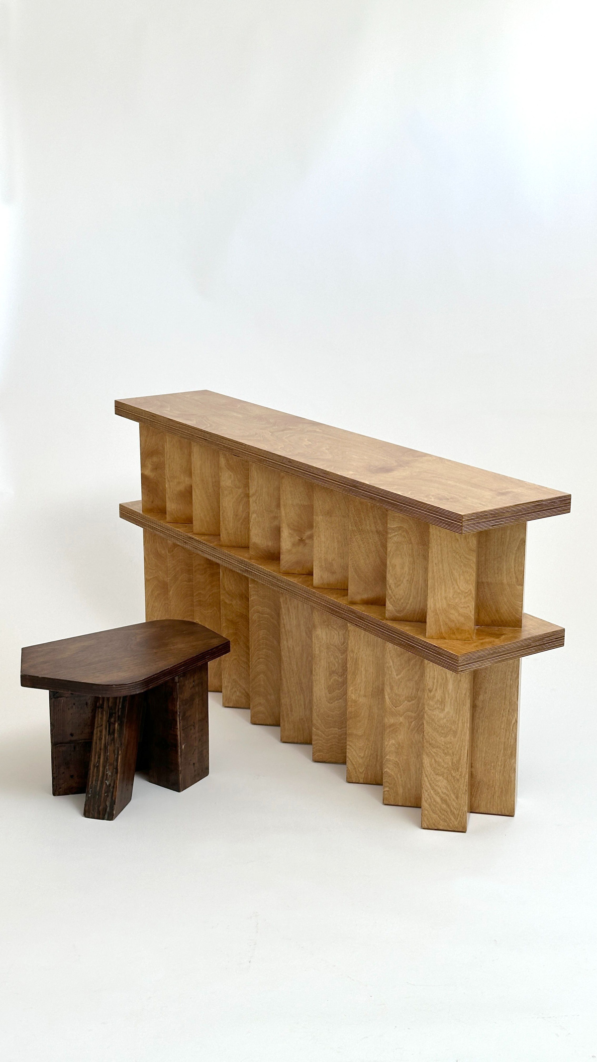 - “Most people who do this kind of work use a veneer piece to cover the exposed sides of the wood that have extra detailing,” Paul says. “That’s stupid. We make a point to keep it unhidden because it’s so much more visually honest.” From left: Original stool, Foundation console