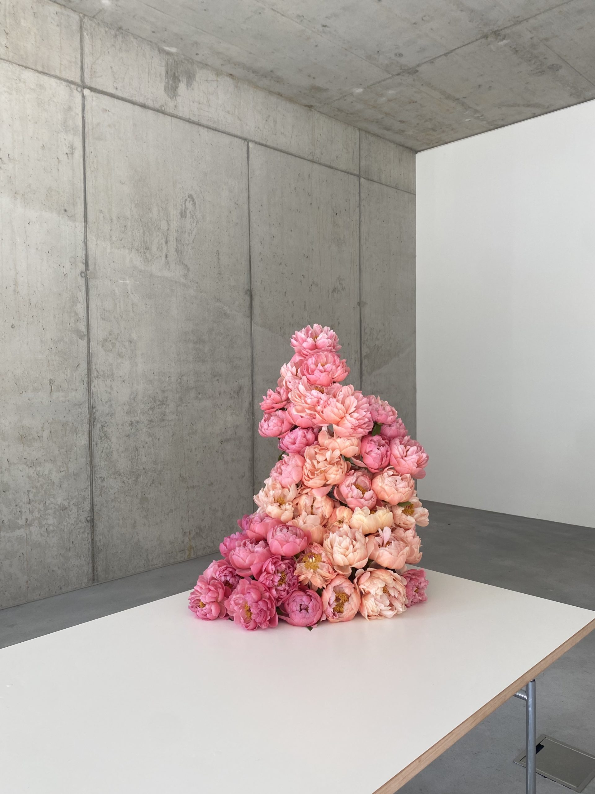 This scene may sound incongruous when describing an artist who works with such a graceful medium as flowers, but Lilo is far and away from the accepted definition of a “floral artist.” Her work is considered, sculptural, avant-garde—transforming a space with manmade-natural juxtapositions. Tellingly, her new studio space is industrial, brutalist almost, with concrete walls and not much furniture. A few potted palms and a back patio of green lawn are the only nods to nature. “Yes!” she agrees. “I really like the contrast. I didn’t really want to move into a historic building because I think working with flowers can get really cheesy and baroque. I need contrast.”